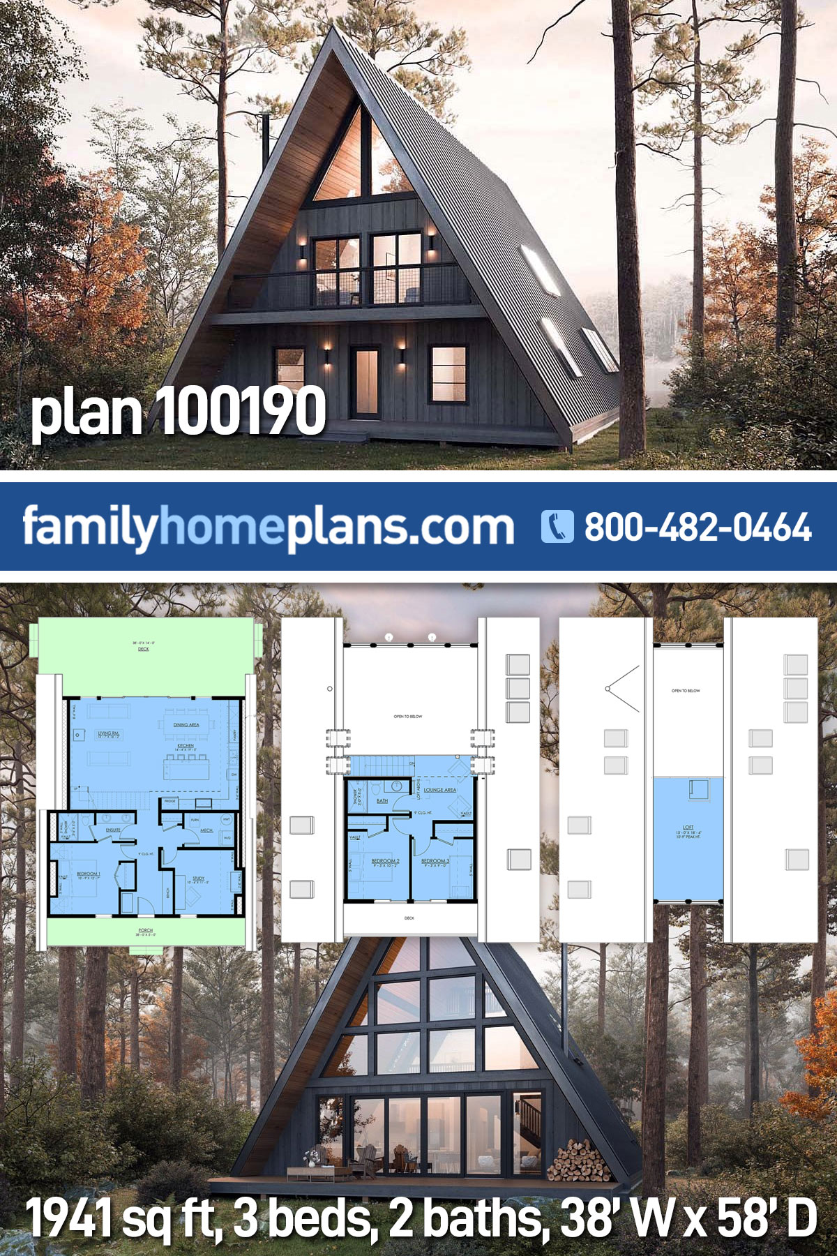 This 1,941 square foot A-Frame Style Cabin Plan offers 3 beds, 2 baths, and a loft up on level 3! Floor-to-ceiling windows nearly fill the wall on the deck side of this modern A-Frame, so it's perfect for your property with a view! Enjoy that view from anywhere inside the open living room, dining area, and kitchen. The kitchen has a very large island including seating for 4, and the dining table will accommodate another 10 people. Guests will spill out to the deck on a summer night and chit chat while watching the fireflies light up the night. Level 1 also has a bedroom, bathroom, study, and mechanical room. From level 2, you can access a deck balcony, or you can go from the lounge to the top level loft via ship's ladder.
