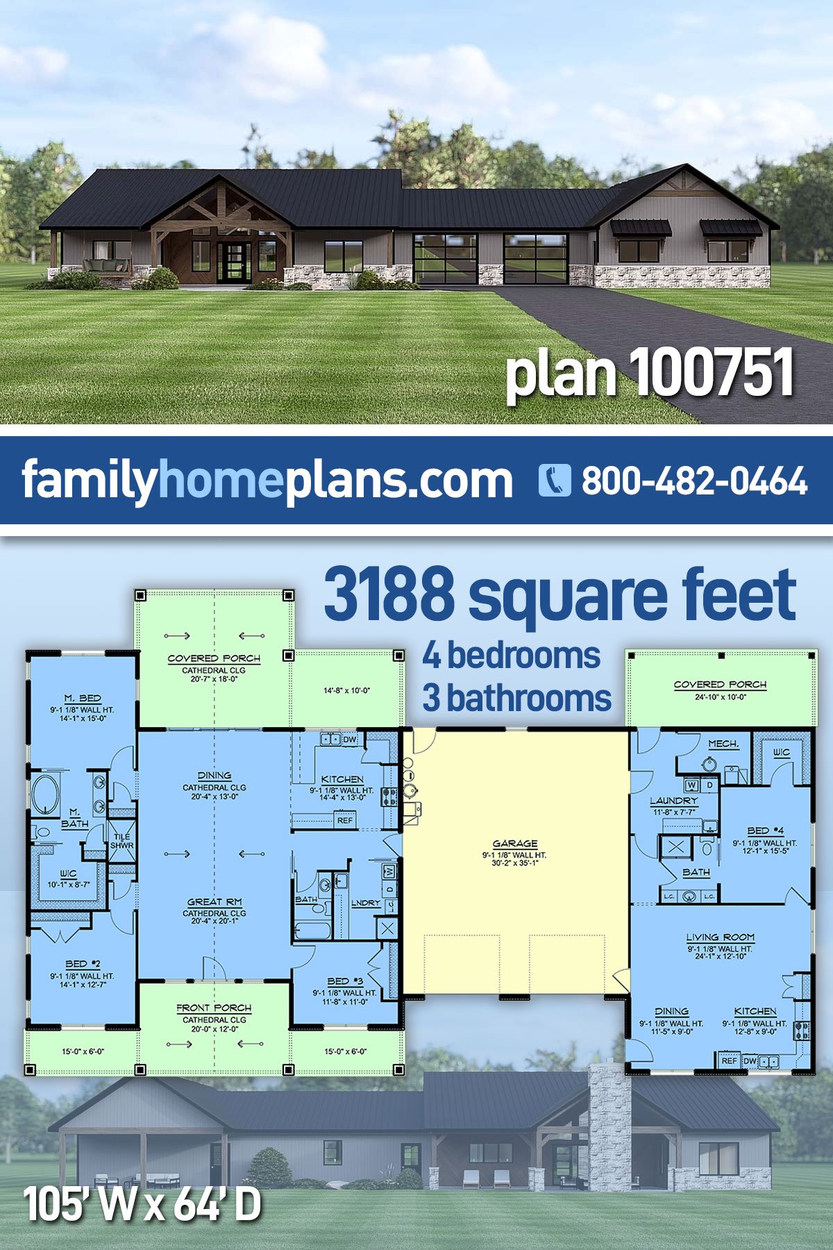 This stunning Modern Barndominium Plan combines contemporary comfort with rustic charm, offering 3,188 sq. ft. of finished living space with 4 bedrooms, 3 bathrooms, and a 2-car garage spanning 1,084 sq. ft.
