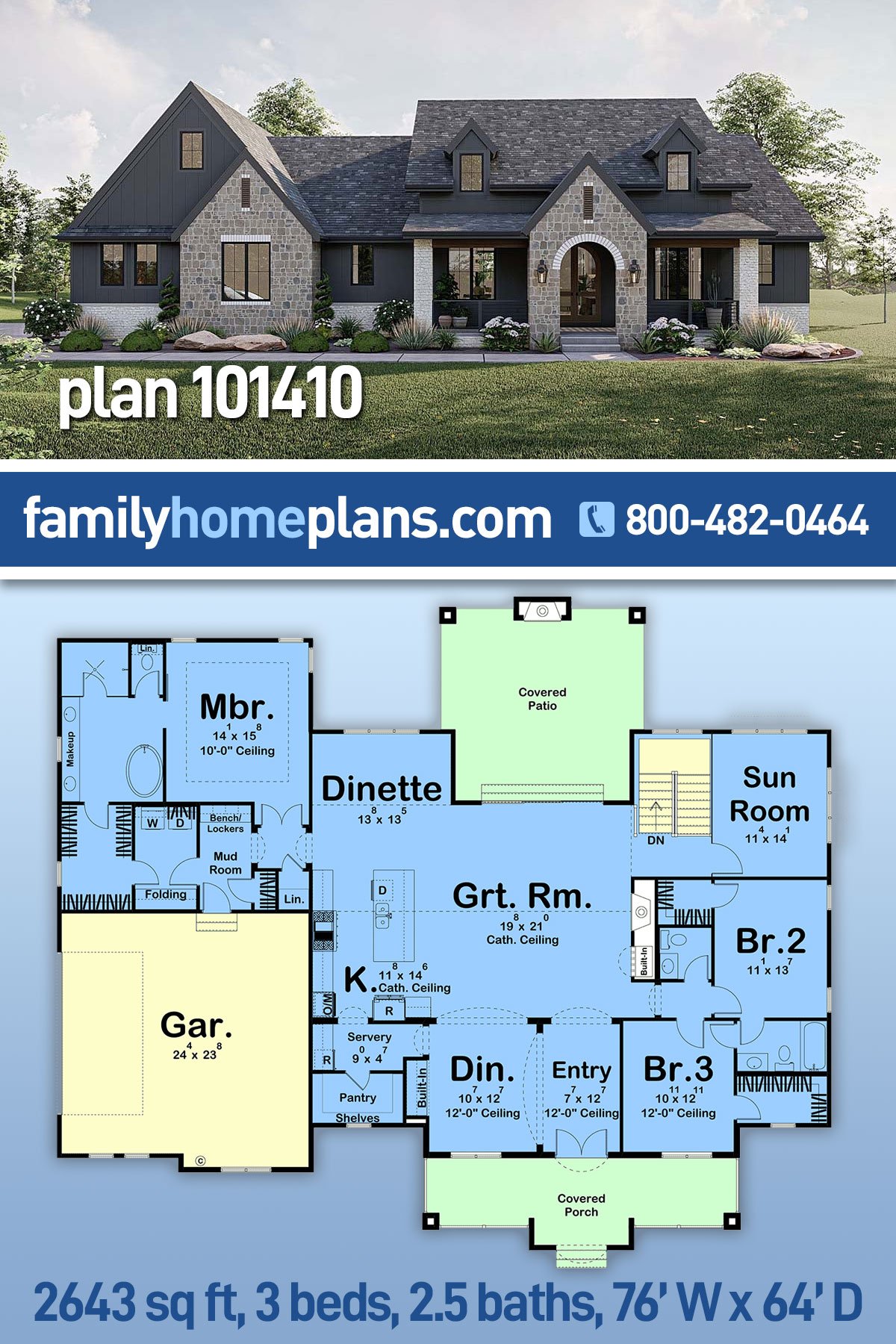 A Modern Cottage style house plan with 2643 square feet, 3 bedrooms and 3 bathrooms. The exterior of this plan is jaw dropping with combinations of dark board and batten siding, as well as two different stone types as accents.