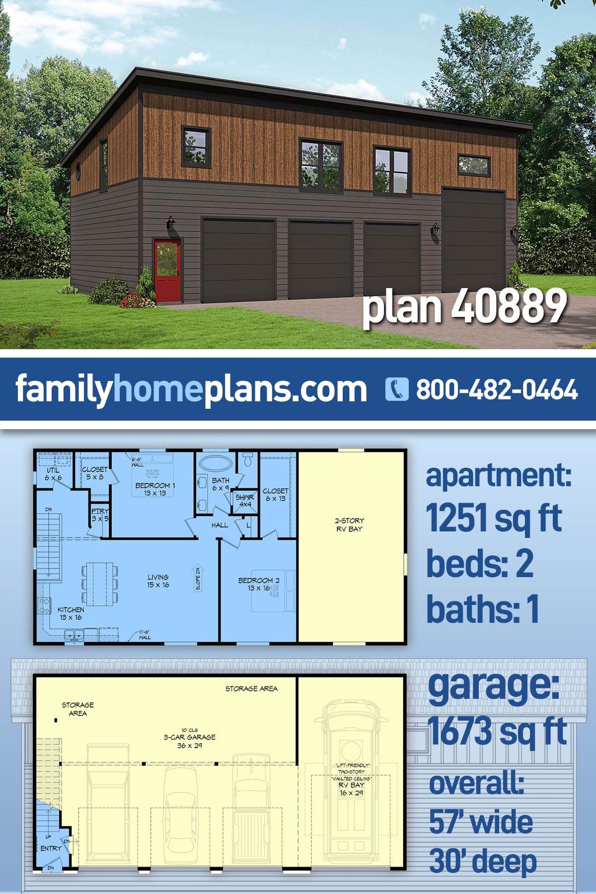 Modern Style Garage Apartment Plan With RV Bay (Plan 40889) offers a striking solution for those needing serious garage space with stylish living above. With 1,251 sq ft of total living area, this plan packs 2 generous bedrooms and 1 full bathroom into the upper level. On the ground level there’s parking for 3 regular-sized vehicles under three overhead doors (each 9' × 9'), plus storage space in the back, plus a dedicated RV bay featuring a large 12' × 14' door. Upstairs, each bedroom includes a walk-in closet. The open living area showcases a kitchen with a walk-in pantry and an eat-at island, shared bathroom with private toilet closet, and a laundry room for convenience.