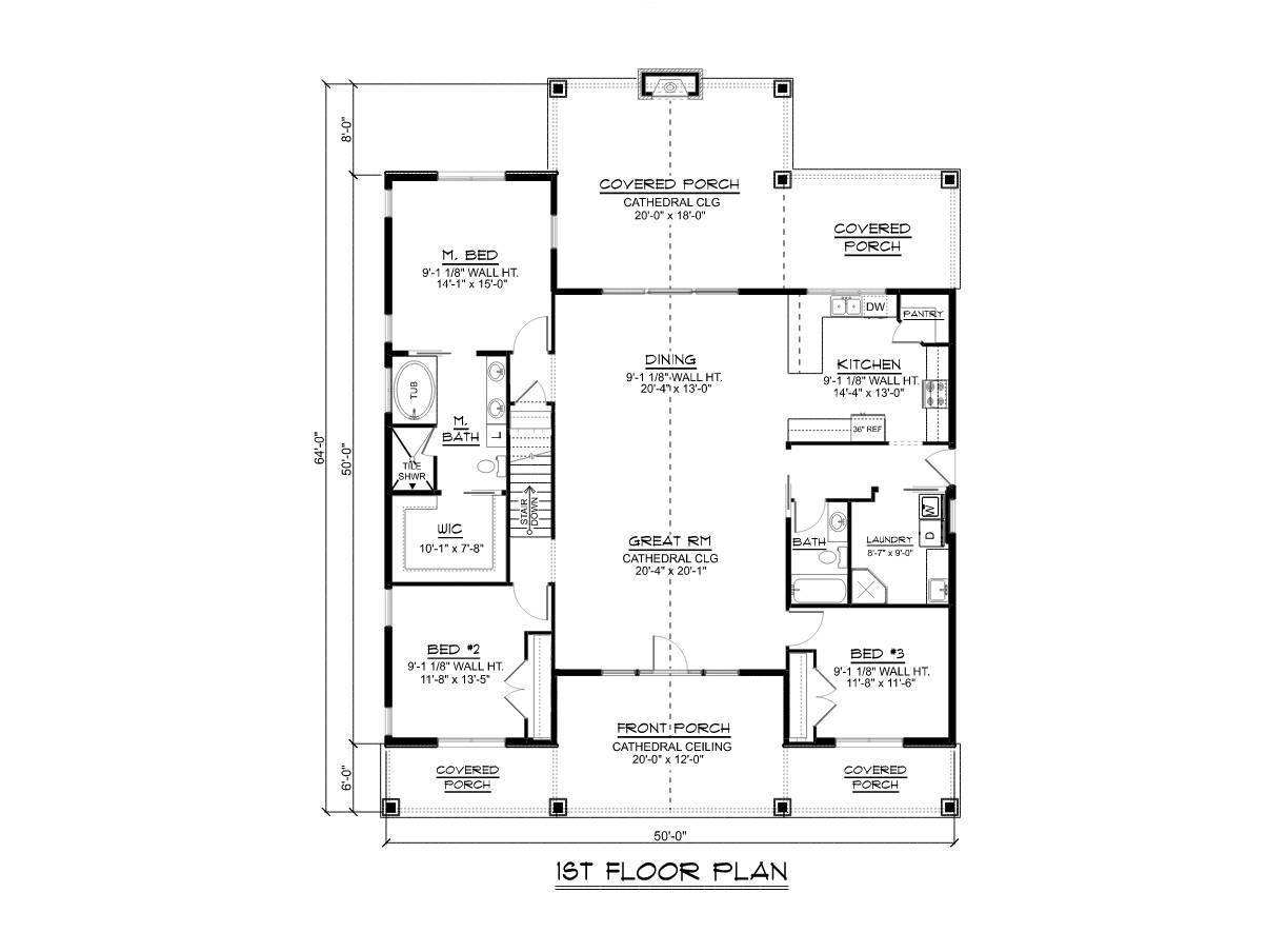 A: These print on 24 x 36in paper. The wall heights are 9' 1 1/8" because precut studs are 104 5/8", and then with three plates added (1 1/2" each), this comes out to the total. This is a standard wall height, but after all materials are added in the finished home (ceiling drywall, flooring), you are left with a 9' ceiling. I hope this makes sense, please let us know if you have any other questions.