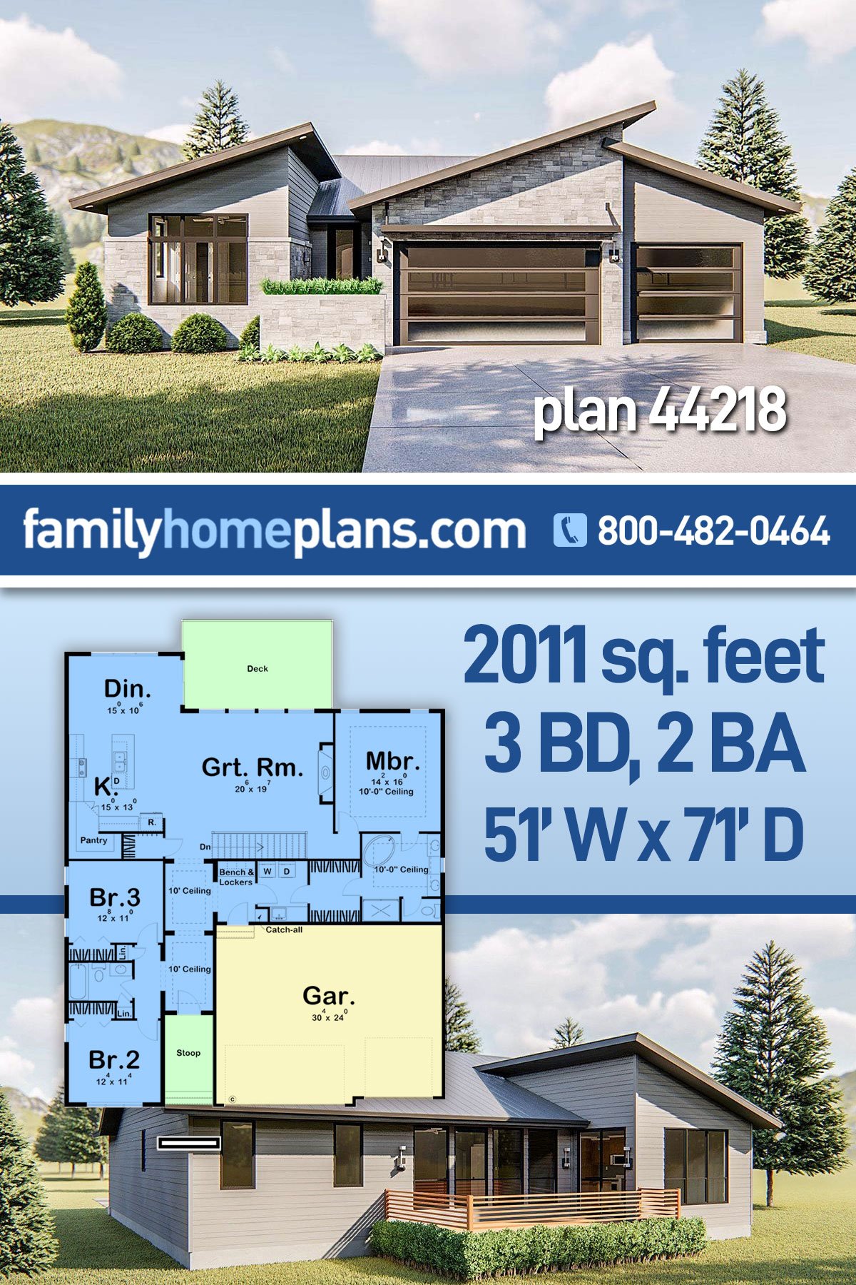 Contemporary, Modern, Retro Style House Plan 44218 with 2011 Sq Ft, 3 Bed, 2 Bath, 3 Car Garage