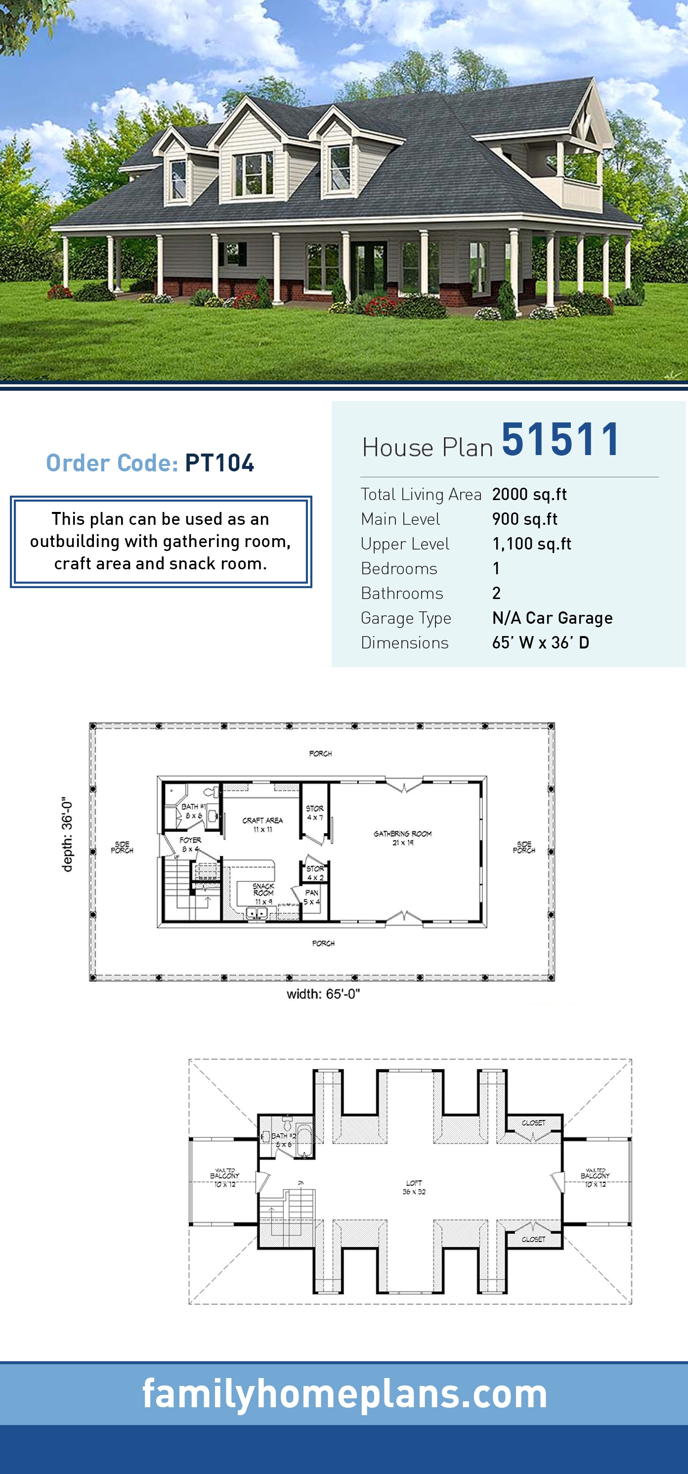 Country, Southern, Traditional Style House Plan 51511 with 2000 Sq Ft, 1 Bed, 2 Bath
