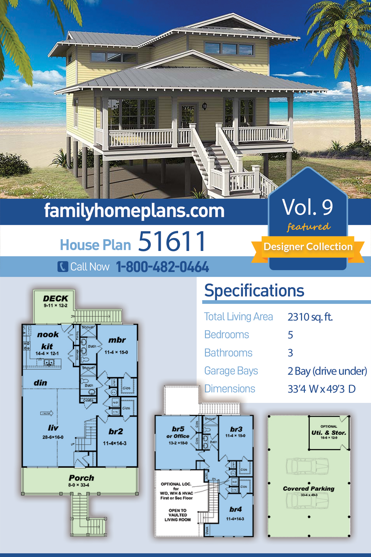 Plan 51611 | Coastal, Contemporary, Cottage House with 5 Bed, 3 Bath, 2 Car