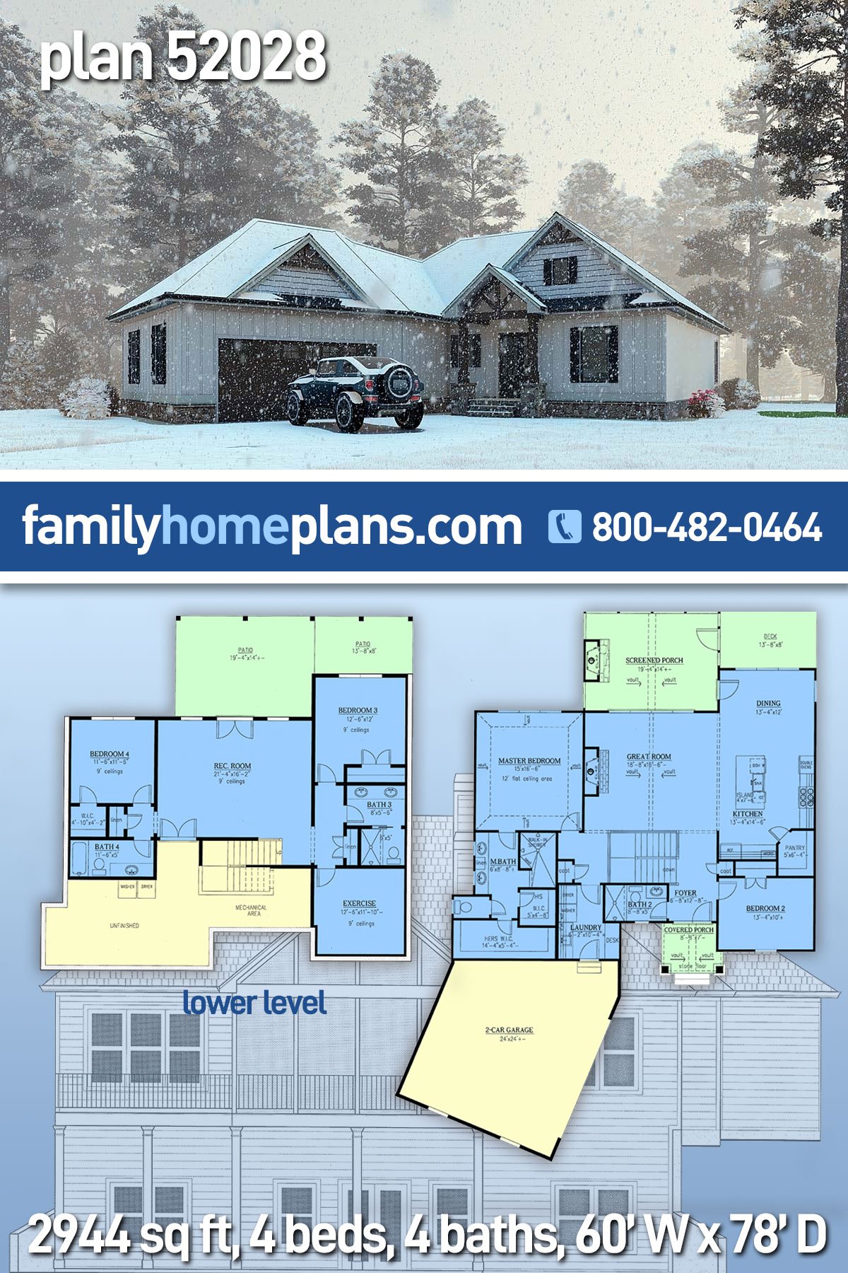 Step into open, elegant living in Home Plan With Angled Garage & Lower Level (Plan 52028). Total Living Area: 2,944 sq ft, 4 bedrooms, and 4 bathrooms. As you arrive, the angled two-car garage adds visual interest and great curb appeal. The heart of the home is the great room with vaulted ceiling and fireplace, which flows into the kitchen boasting a large walk-in corner pantry. Adjacent is a screened back porch complete with an outdoor fireplace—perfect for relaxing or entertaining. The master bedroom also features a vaulted ceiling and a luxurious ensuite with separate his and her walk-in closets. The lower level rounds things out with two more bedrooms, an exercise room, and a roomy rec room, making this layout perfect for both everyday living and guest space.