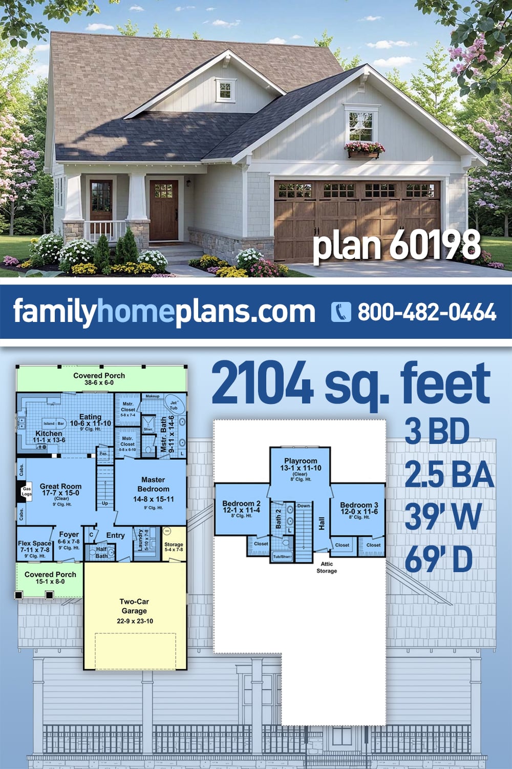 Two additional bedrooms and a large shared bathroom are located upstairs alongside a bright Playroom, giving kids or guests a space of their own. A versatile Flex Space near the Foyer is ideal for a home office or hobby nook. Generous porches in both the front and rear provide ample room for outdoor living. Additional highlights include a walk-in pantry, private Laundry Room, half bath for guests, extra Storage Room, and a roomy two-car Garage. This plan delivers cozy charm and smart living in one elegant package.