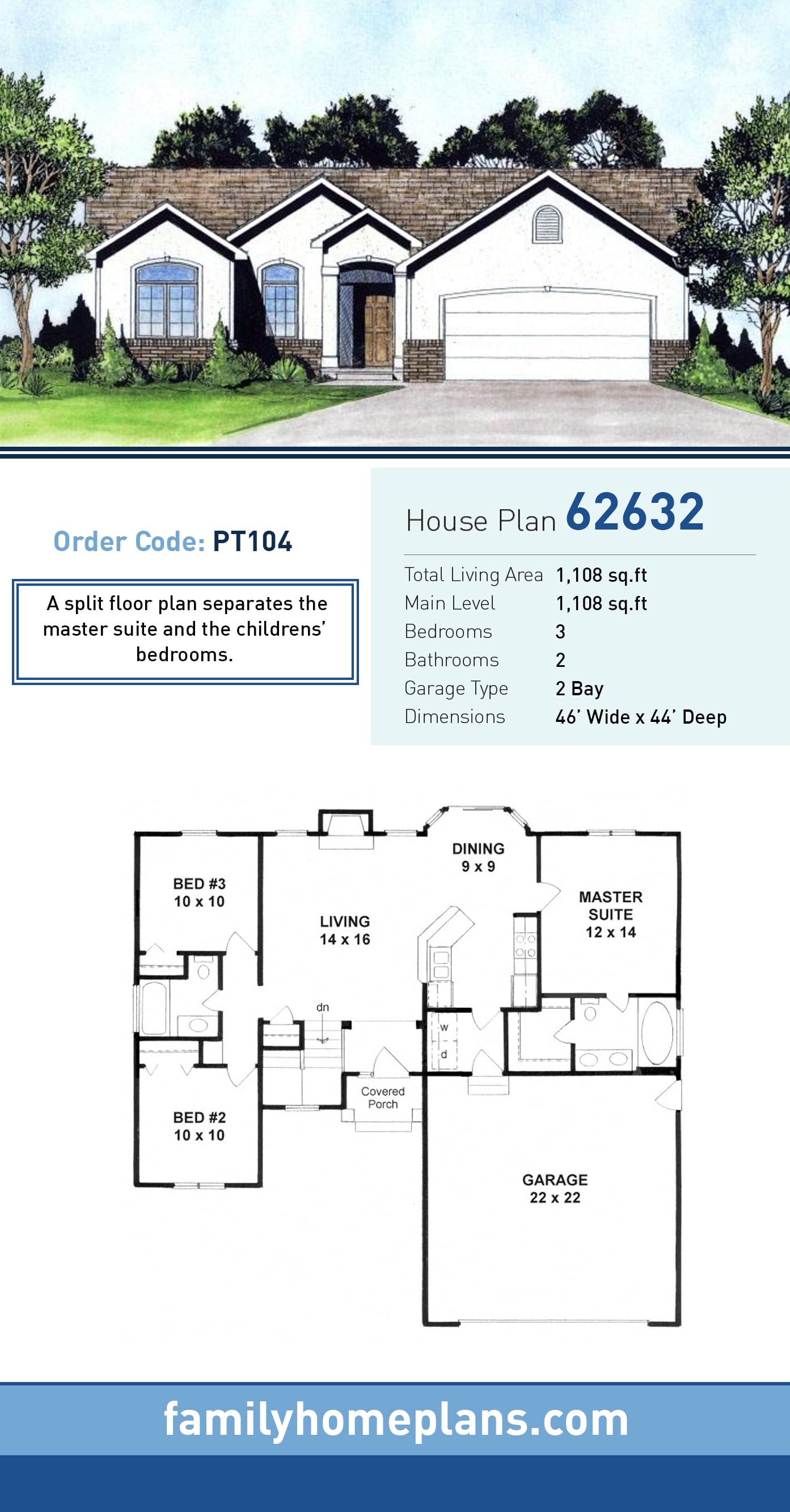 European, Ranch Style House Plan 62632 with 1108 Sq Ft, 3 Bed, 2 Bath, 2 Car Garage