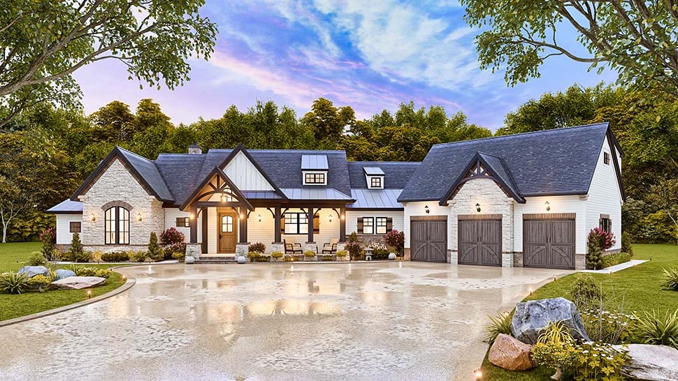 French Country Style House Plan With Fab Outdoor Living Area (Plan 72221) — This elegant 2,531 sq. ft. home features 3 bedrooms and 3.5 bathrooms with a charming French country exterior highlighted by detailed woodwork and graceful porch columns. The foyer opens to a grand great room with a fireplace and French doors leading to a covered porch. The dining area also offers access to a grilling patio that wraps around to a private porch for bedroom three, which includes its own bath. The split floor plan places the luxurious master suite opposite, featuring dual sinks, a freestanding tub, walk-in shower, and his-and-hers closets. A three-car angled garage, spacious utility room, and large upstairs bonus area with an optional in-law suite complete this stunning design.