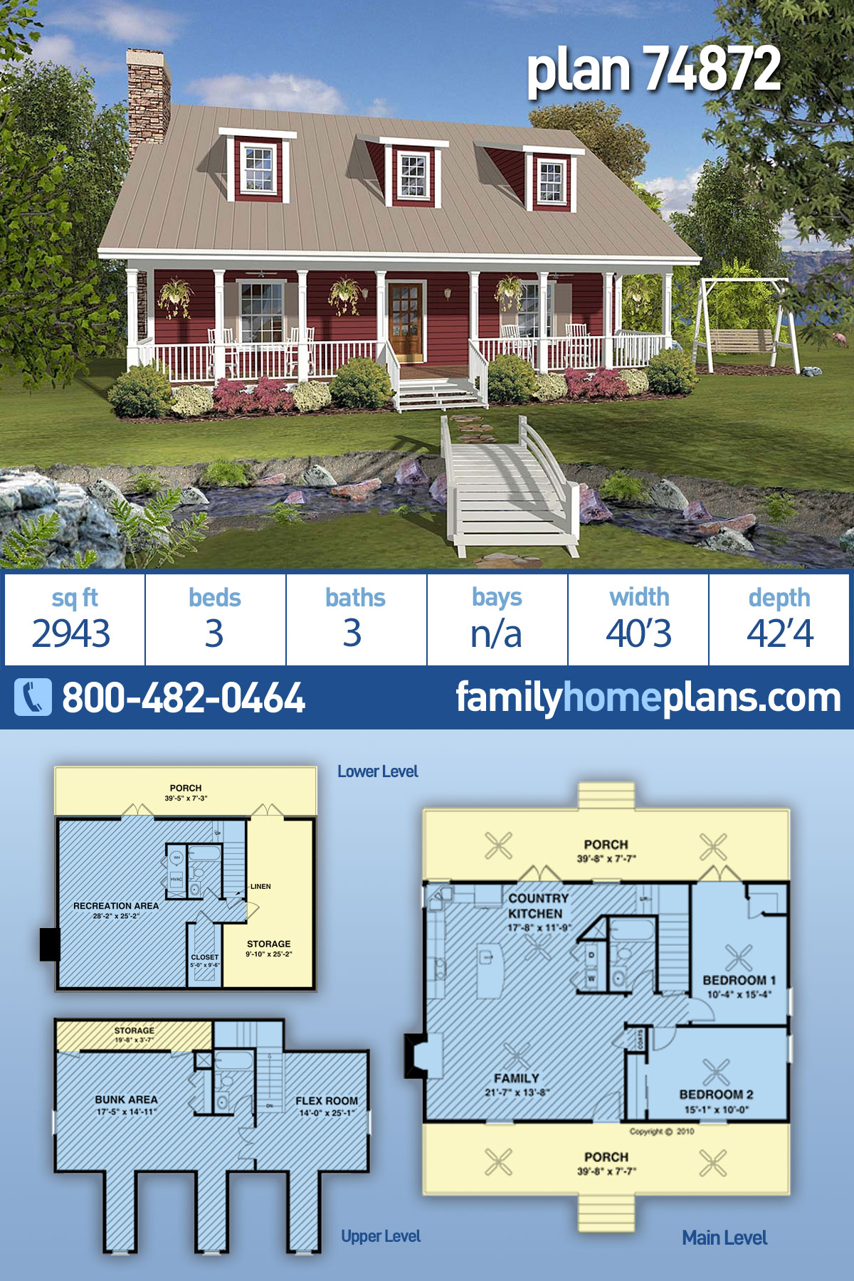The upper level, lit by three dormers and two side windows, provides a bunk room, a full bath, a flex room and plenty of storage space. And finally, the lower level includes a large recreation area, with easy access to a full bath and spacious walk-in closet. Two sets of french doors provide quick access to the full-width covered rear porch.