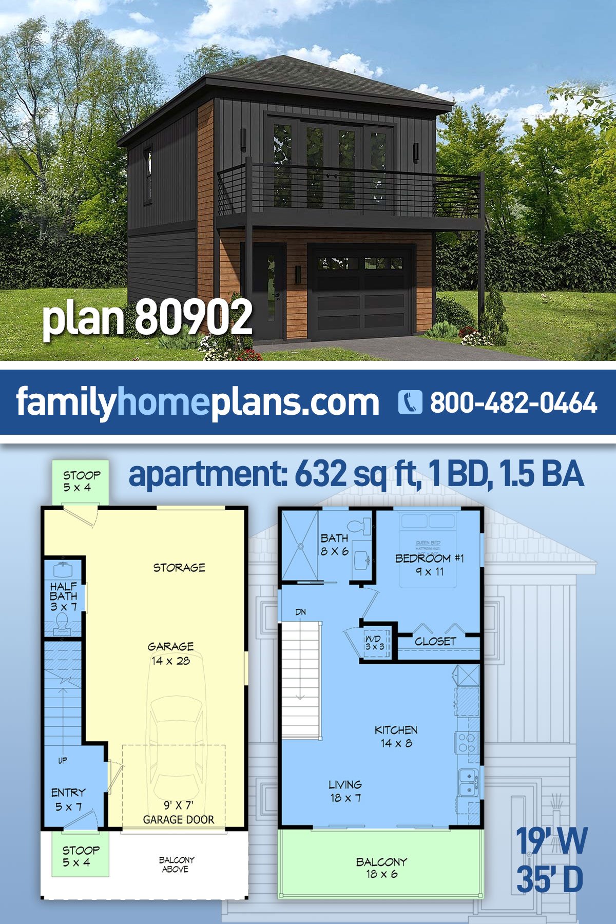 Plan 80902 | Contemporary, Modern Garage-Living with 1 Bed, 2 Bath, 1 Car