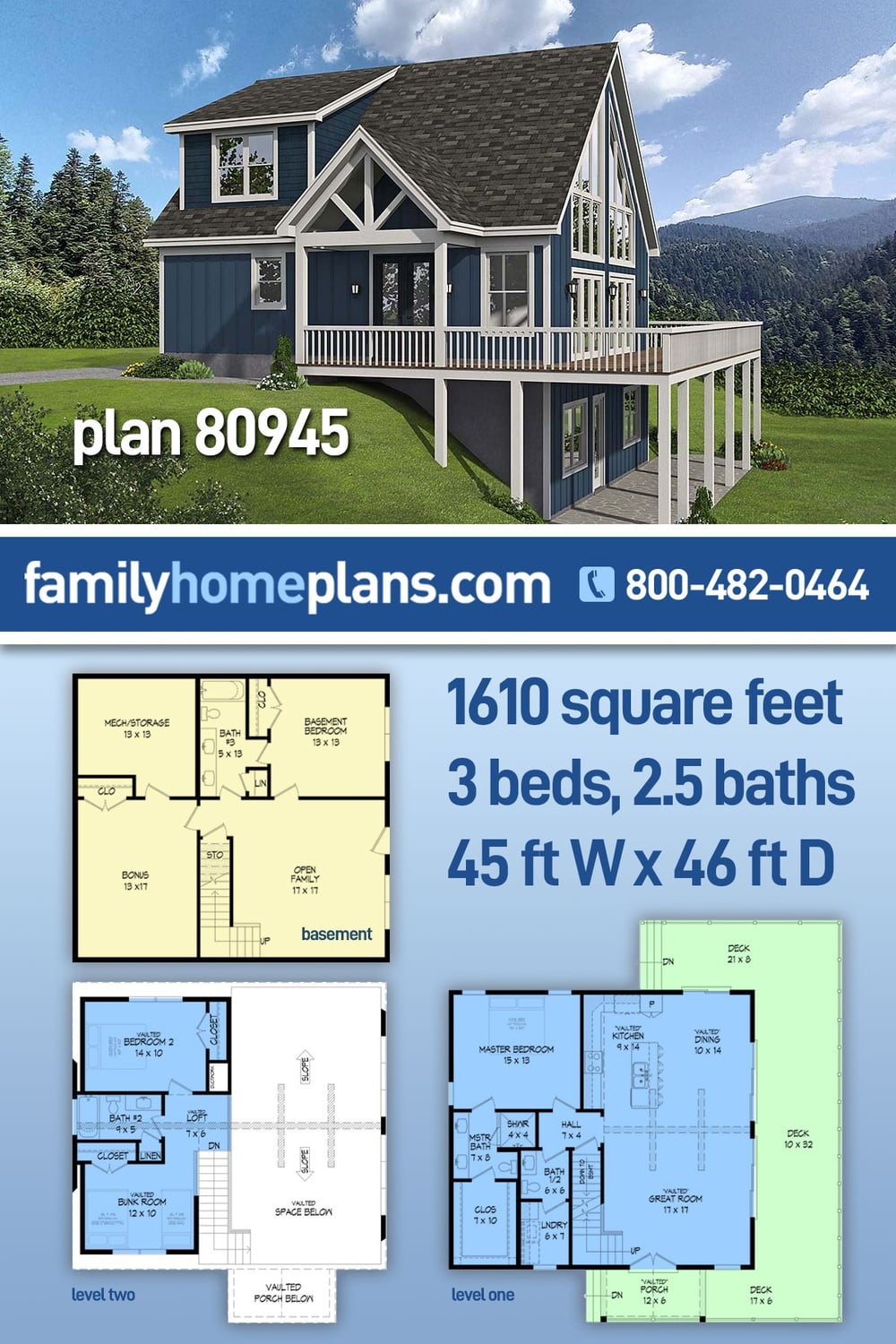 A-Frame House Plan 80945 has 1,610 square feet living space on the main and upper levels. Officially, the plan has 3 bedrooms and 2.5 bathrooms. However, the design gives you several options to expand the living space. For example, the walkout basement offers a basement bedroom, bonus room, family room, and full bath. Best of all, your family will spend time outside on the expansive deck.