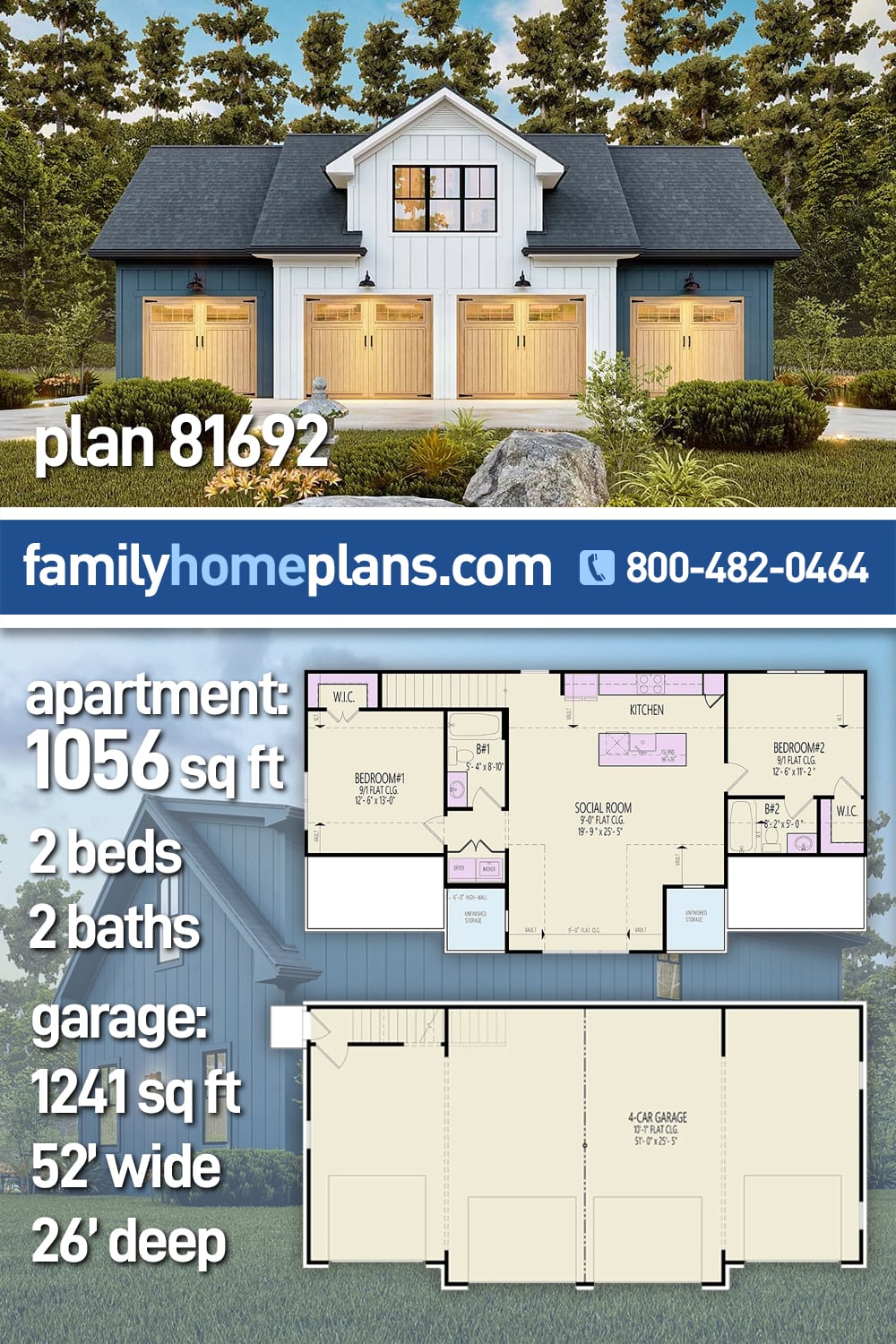 4 Bay Garage Apartment Plan With 2 Bedrooms (Plan 81692) is a versatile design that pairs generous parking with comfortable living, offering 1,056 sq ft of living area, 2 bedrooms, and 2 bathrooms above a 1,241 sq ft drive-in garage. The four front-entry bays make this plan ideal for car enthusiasts, storage needs, or workshop space. A rear door entry leads upstairs to the apartment, where the bedrooms are thoughtfully placed on opposite sides for privacy. One bedroom enjoys a walk-in closet and private full bath, while the second bedroom is served by a hall bath nearby. A central social room anchors the layout with a well-sized kitchen and island, complemented by a washer and dryer closet and additional unfinished storage space.