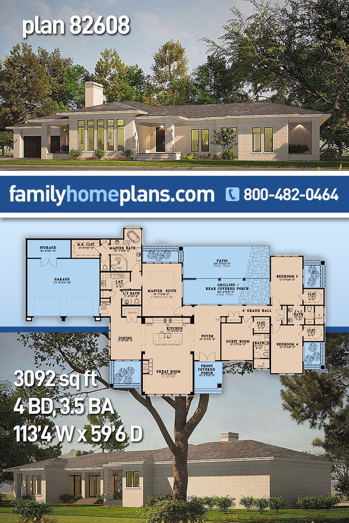 Contemporary, Mediterranean, Prairie Style House Plan 82608 with 3092 Sq Ft, 4 Bed, 4 Bath, 2 Car Garage