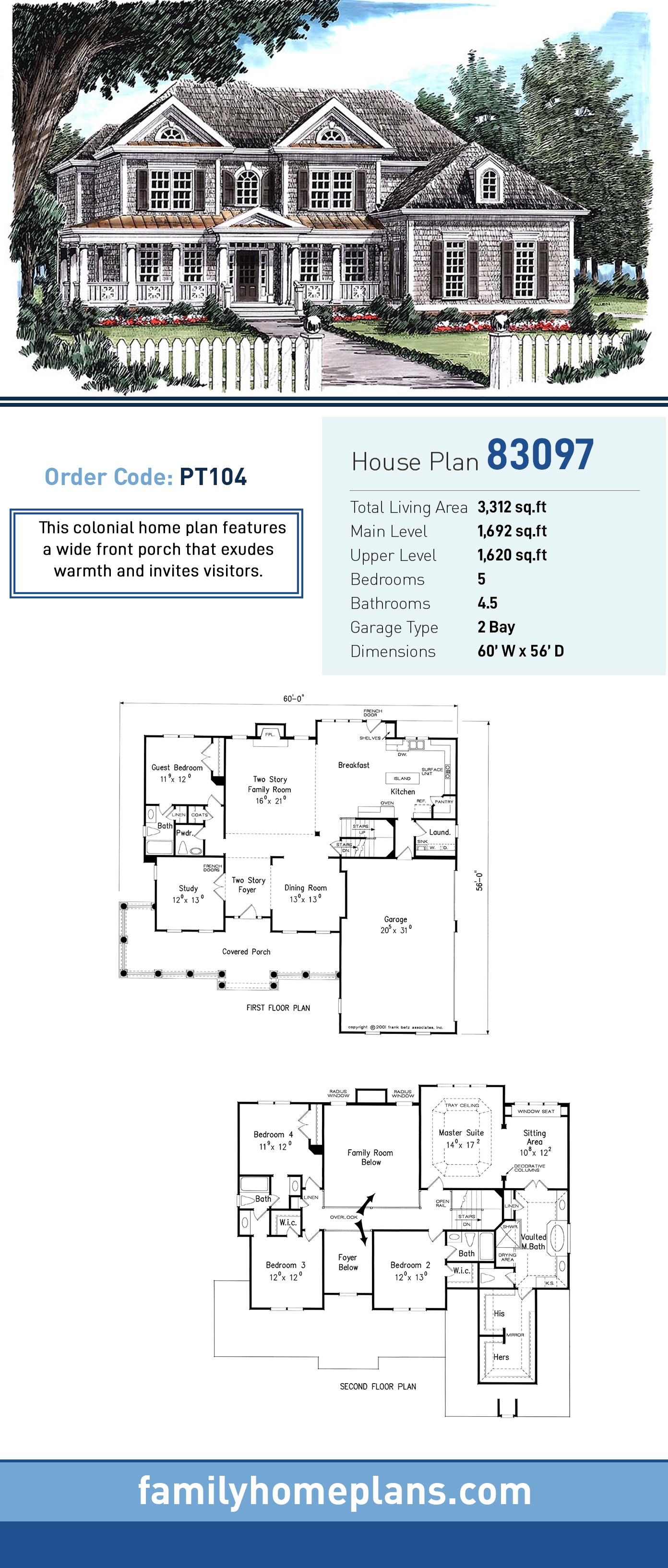 Traditional House Plan - This traditional home plan features a wide front porch that exudes warmth and invites everyone to visit. Rocking chairs will be perfect for quiet time with a good book or lively conversation with neighbors and friends. Traditional style and design elements make a statement on the exterior. A stable brick water table provides the base along with cedar shake siding, multi-paned windows and reversed gables create the classic lines and curb appeal. The first floor is luxurious and spacious with modern amenities. The two- story family room is the focal point and is centrally located. The kitchen with a large island is fully equipped for the family chef. The breakfast room is sized to hold a large farm-style table that will surely be the family's favorite gathering spot. The formal dining room and study welcomes guests with comfort and style. This level also includes a guest suite with its own bath for an elderly parent or visitor. The upper level has a master suite fit for royalty. The suite has a sitting room with a window seat and tray ceiling. The master bath has separate vanities and walk-in shower. There are his-and-her closets for a large wardrobe. There are three additional bedrooms, one with a private bath and a Jack-and-Jill bathroom between the other two bedrooms. The upper balcony overlooks the foyer and family room.