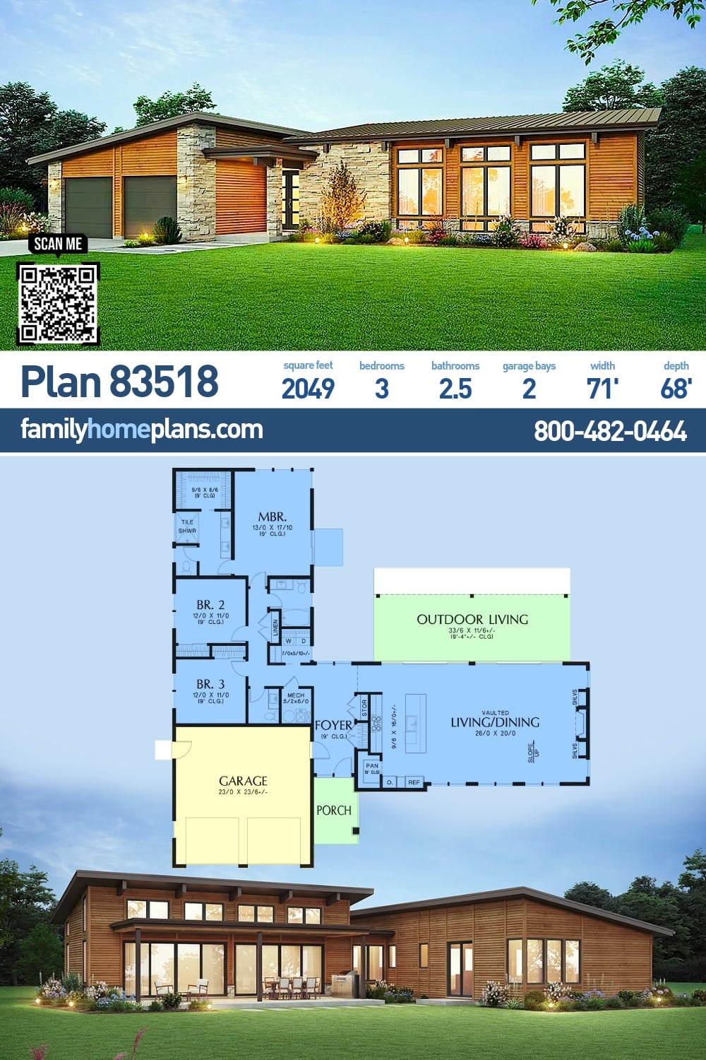 This mid-century modern house plan delivers 2,049 sq ft, 3 bedrooms, and 2.5 baths, wrapped in a striking wood-and-stone exterior. Three sets of floor-to-ceiling windows elevate curb appeal and flood interiors with natural light.