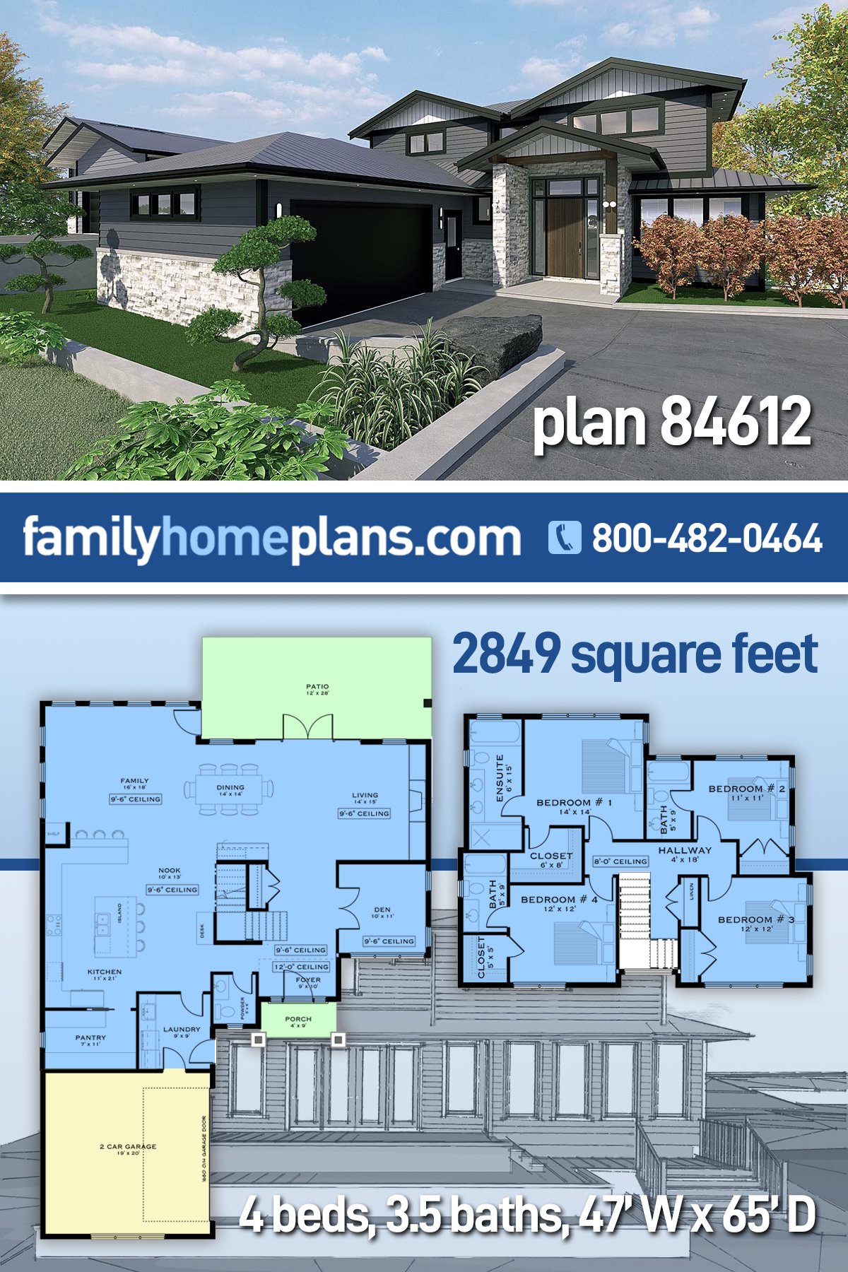 Chic Contemporary House Plan 84612 wows with a sharp exterior and a sprawling floor plan! With 2,849 sq ft of living space, 4 beds, 3.5 baths, and a huge back patio, your family has room for every activity. The main floor has a sunny family room, cozy den, dining area, living room with fireplace, half bath, a very large kitchen with island and walk-in pantry, and a laundry room at the 2 car garage entrance. All 4 bedrooms are upstairs, and there is no wasted space on this well-designed plan!