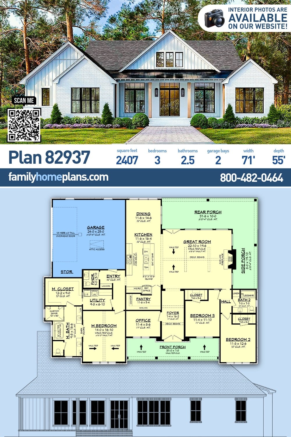 Transitional farmhouse plan 82937 offers 3 bedroom, 2.5 bathroom living with 2,407 square feet of well balanced space combining classic charm and modern design.