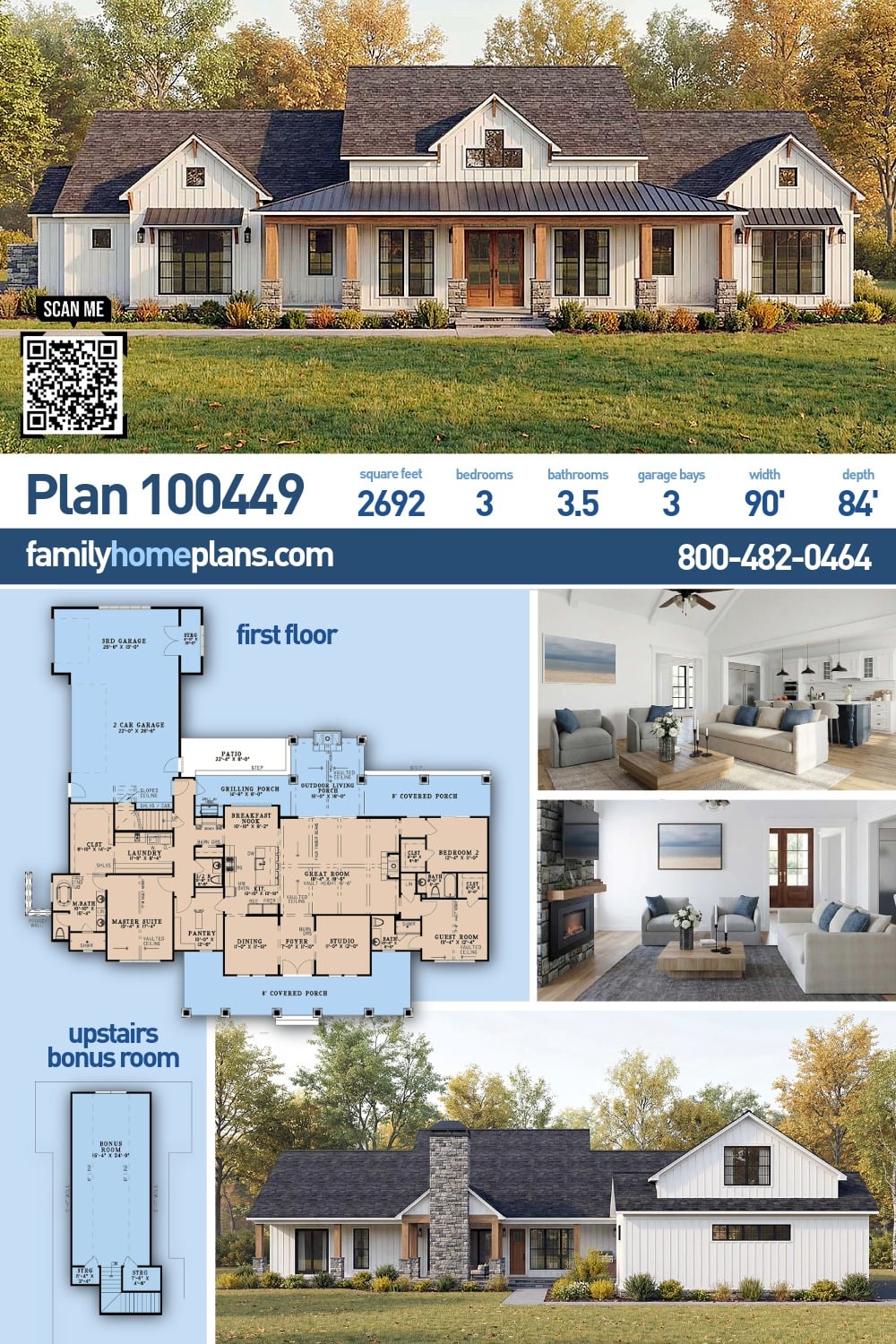Contemporary, Country, Craftsman, Farmhouse Style House Plan 100449 with 2692 Sq Ft, 3 Bed, 4 Bath, 3 Car Garage