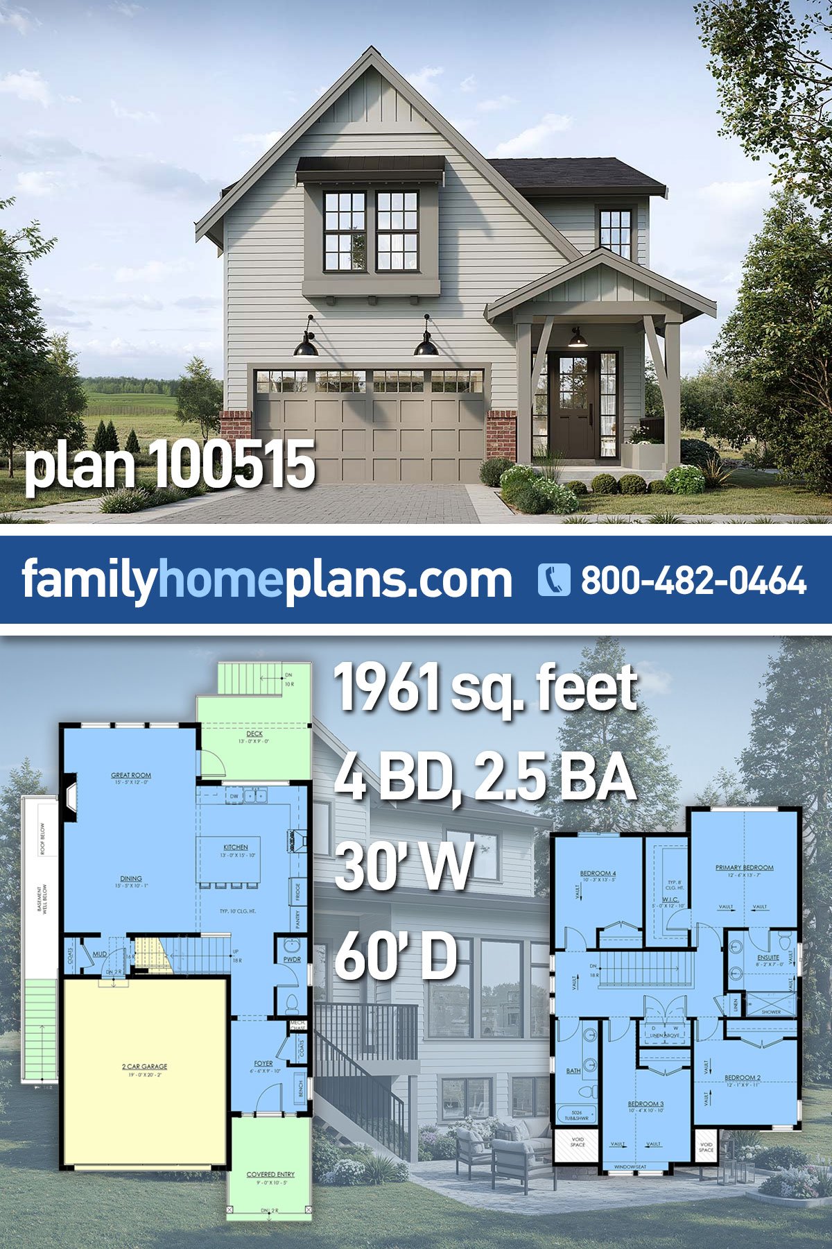 Traditional Style House Plan For a Narrow Lot (Plan 100515) – This charming 2-story home offers 1961 sq ft of living space with 4 bedrooms and 2.5 bathrooms. A welcoming foyer features a bench and coat closet, while the open great room boasts a cozy fireplace. The spacious kitchen includes a large island and flows seamlessly to the deck for outdoor living. All four bedrooms are upstairs, each with vaulted ceilings that enhance light and space. Designed for comfort and practicality, this plan is ideal for families wanting style and function in a smart, narrow-lot design.