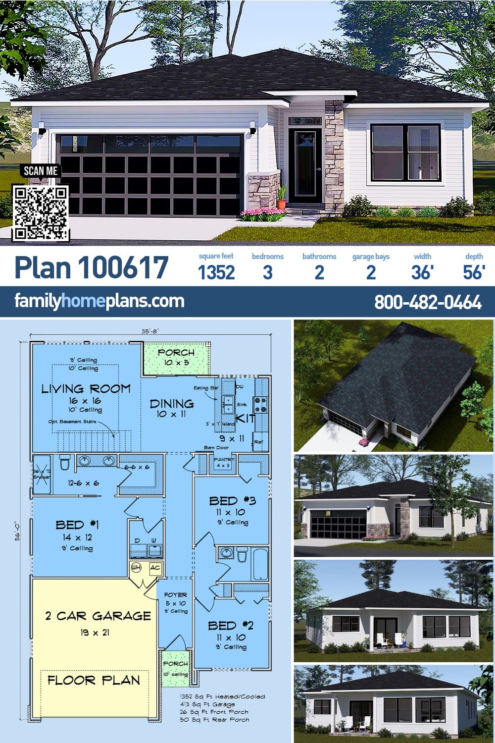 Contemporary, Modern Style House Plan 100617 with 1352 Sq Ft, 3 Bed, 2 Bath, 2 Car Garage