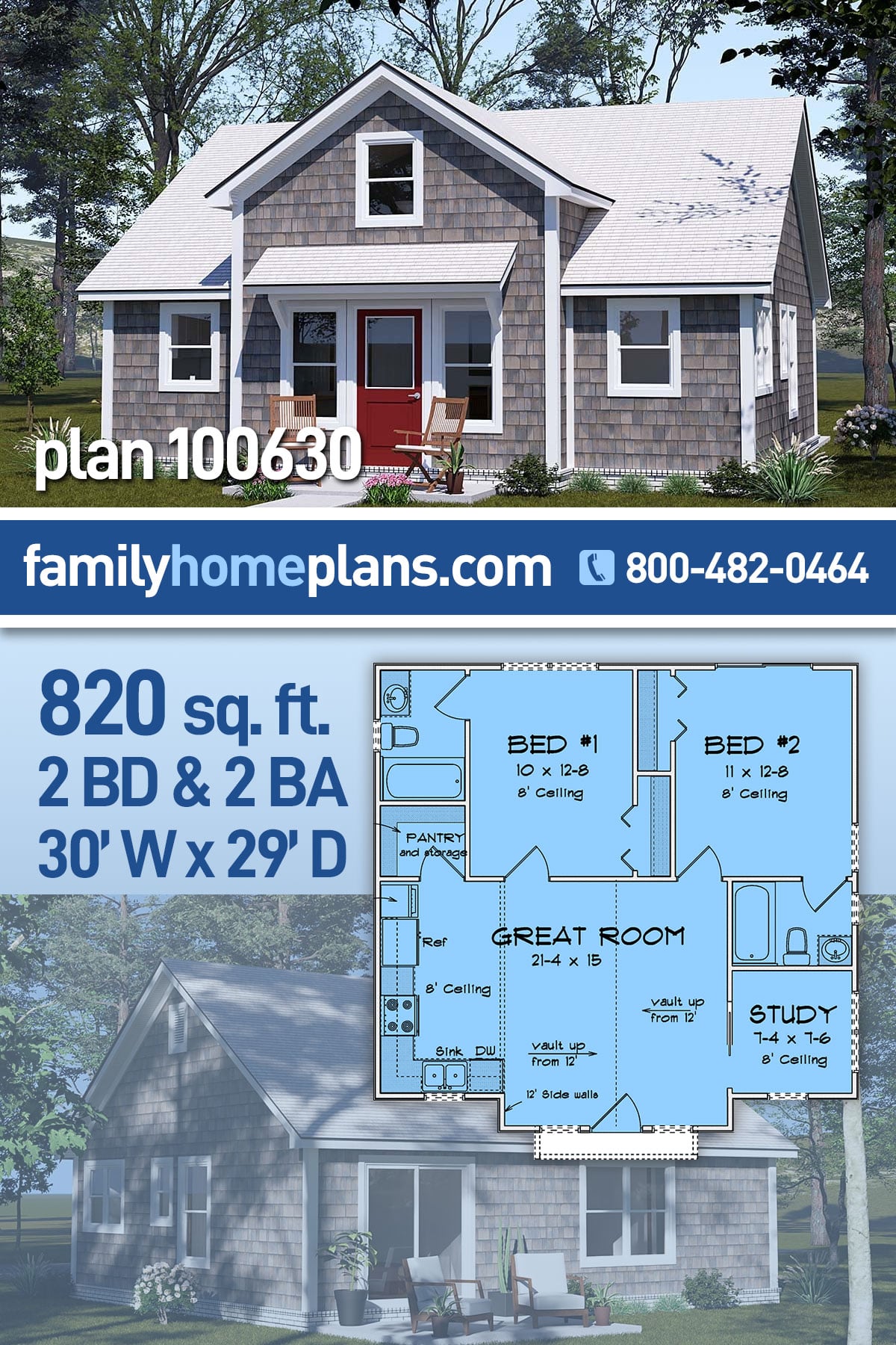 Cottage Style Home Plan With 820 SQ FT (Plan 100630) – Perfect for a cozy getaway or downsized living, this charming 820 sq ft cottage offers 2 bedrooms and 2 bathrooms in a compact yet well-designed layout. The exterior showcases weathered cedar shingle siding for timeless appeal. Inside, a vaulted great room with 12-foot walls creates an airy, open feel, connecting to an L-shaped kitchen with front-facing window views and a handy walk-in pantry. A sliding door leads to a small study—ideal for reading or working from home. Both bedrooms are located at the rear, each featuring its own private full bath, offering comfort and privacy in this delightful one-story retreat.