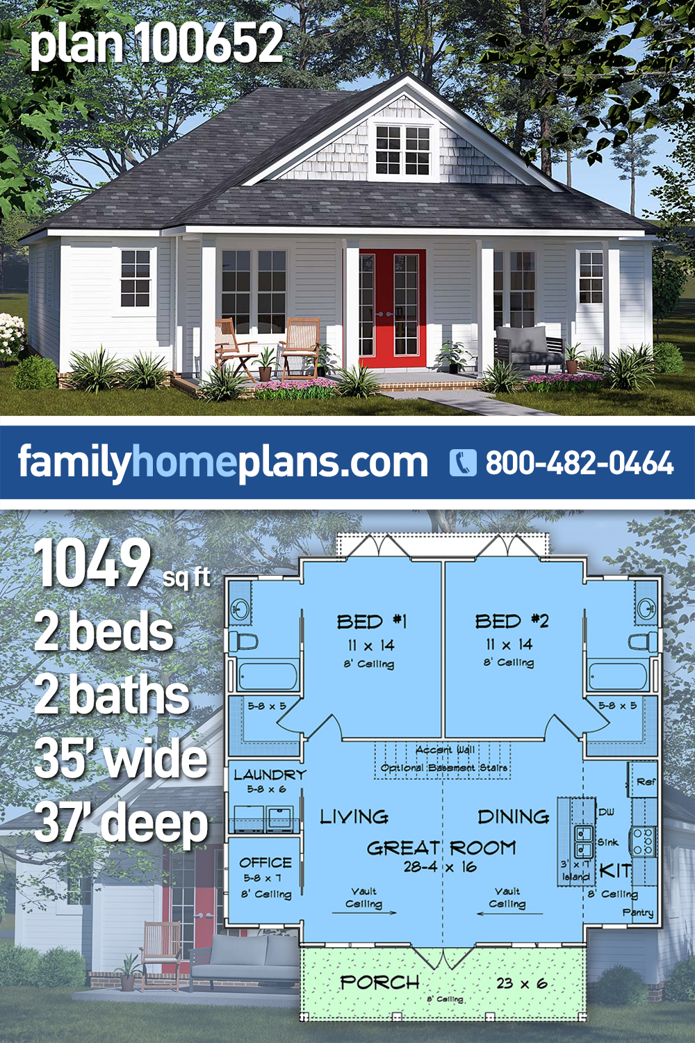 The 2 Bedroom Cottage Plan With Additional Office (Plan 100652) offers charming, efficient living in 1,049 sq ft with 2 bedrooms and 2 bathrooms. A welcoming 23-foot-wide front porch invites relaxed outdoor seating, while double doors open into a vaulted great room at the center of the home. The open layout places living room to one side and an island kitchen along the opposite wall for easy flow. A pocket door reveals a private office, and a nearby laundry room adds convenience. At the rear, two mirrored bedroom suites each feature a walk-in closet, full bath accessed by pocket door, and double doors opening to the outdoors—creating a bright, retreat-like feel.