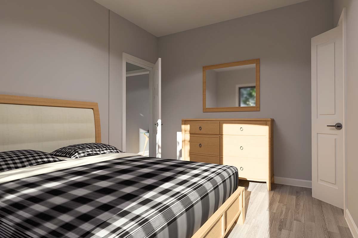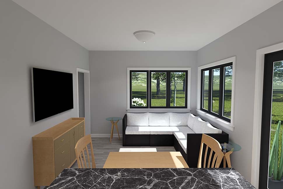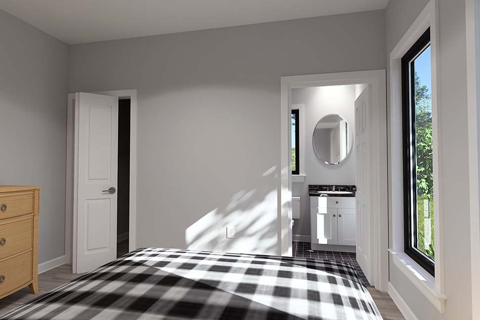 The exterior boasts clean lines and a streamlined modern aesthetic, enhanced by a welcoming front porch ideal for greeting guests or enjoying a morning coffee. This modest porch adds a touch of charm to the contemporary facade, while the 20-foot width and 24-foot depth make this design an excellent fit for smaller lots or urban infill settings.