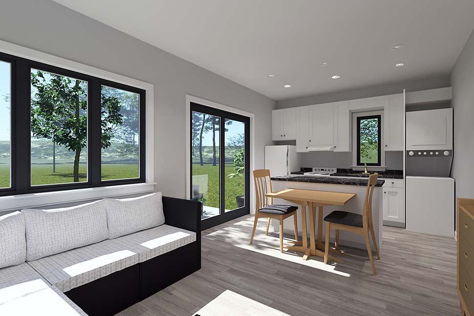 Step inside to an open-concept main living area where entertaining space seamlessly blends with a modern kitchen and living zone. High 9-foot ceilings create a sense of spaciousness, and the efficient layout ensures that natural light fills the living area, making the home feel larger than its footprint. The open floor plan encourages easy flow, making it perfect for hosting friends or relaxing at home.
