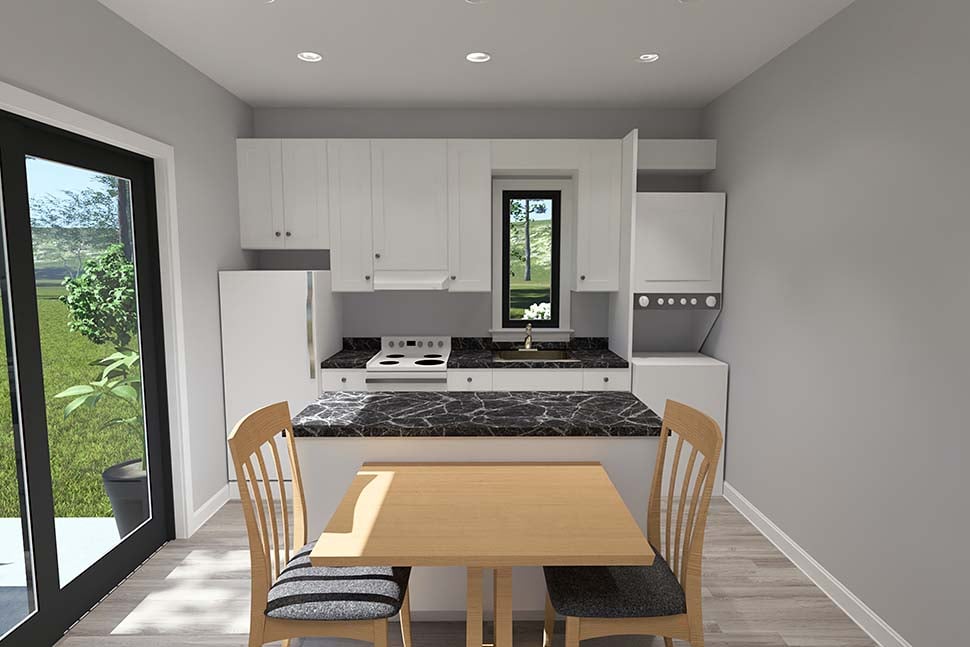 While compact, this design doesn't compromise on convenience. The plan includes modern finishes and the flexibility to select from slab, crawlspace, or basement foundations, allowing for customization to suit your site and storage needs. With no dedicated garage, you have the option to add on or keep the home's minimal footprint for simplicity.