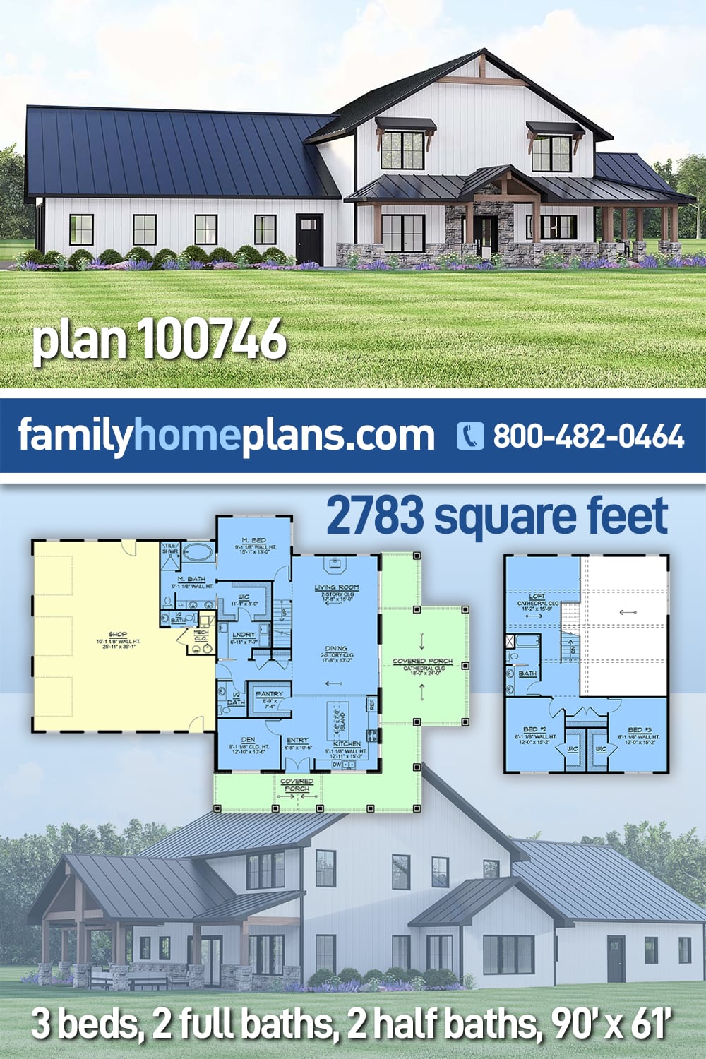 Barndo Plan With Giant Porch and Loft (Plan 100746) blends rustic style and spacious living in 2,783 sq ft with 3 bedrooms and 2 full baths plus 2 half baths. White siding, a metal roof, and a dramatic wraparound covered porch with cathedral ceiling create standout curb appeal. Inside, open living connects the dining area, living room, and island kitchen with a walk-in pantry, while a front den adds flexibility. The main-level primary suite features a large bath and an oversized walk-in closet with direct access to the laundry. The garage/shop offers three vehicle bays, expansive workspace, a half bath, and mechanical storage. Upstairs, two bedrooms with walk-in closets share a full bath, and a vaulted loft overlooks the living space below.