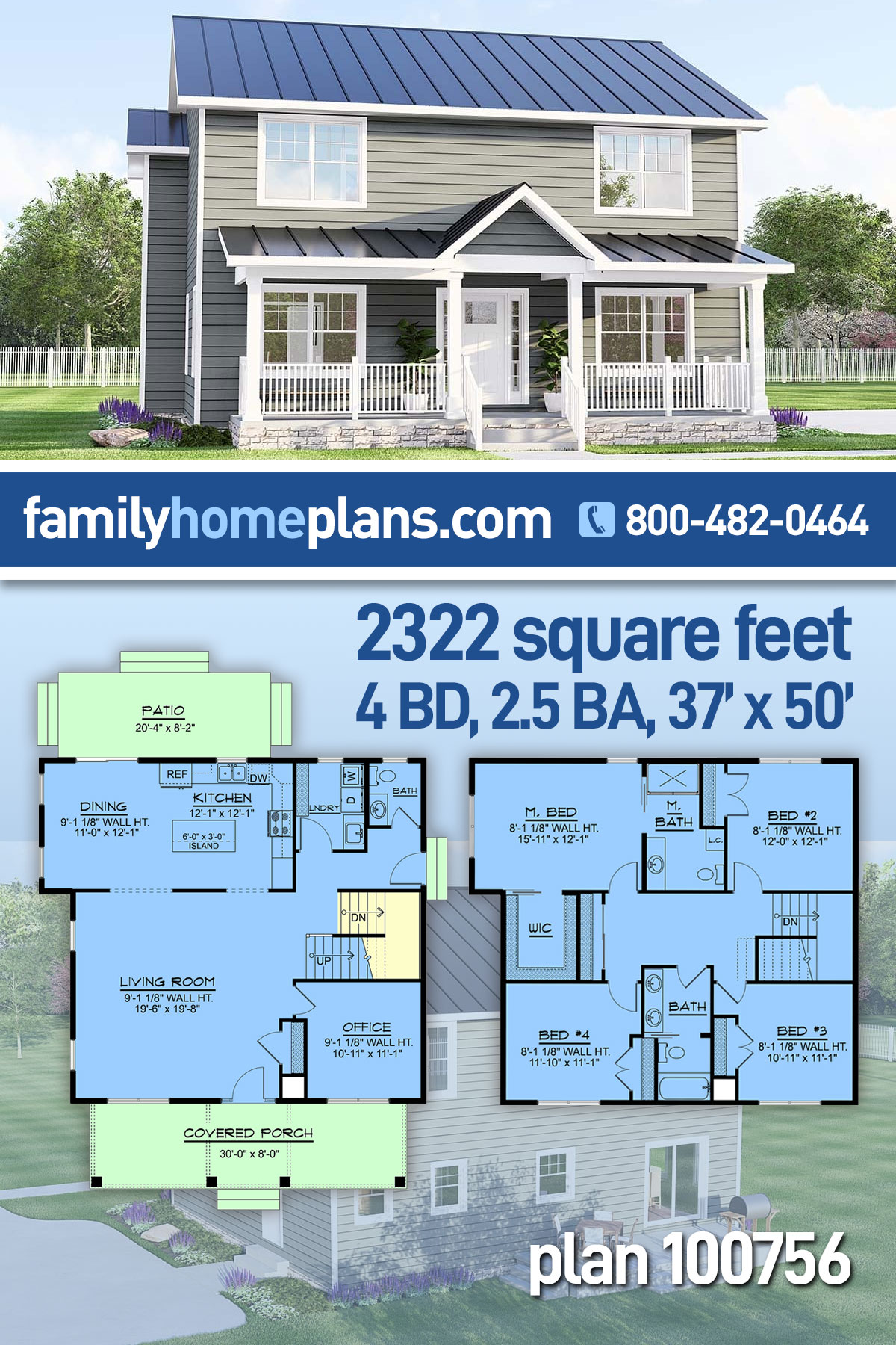Traditional Style House Plan With 4 Bedrooms Upstairs (Plan 100756) offers 2,322 sq ft of total living area with 4 bedrooms and 2.5 bathrooms. A classic covered front porch greets you at the entrance, while a covered back patio invites outdoor living and entertaining. On the main level you’ll find a spacious living room, a well-appointed kitchen with island that flows into the dining area and opens to the back patio, along with a home office, a half bath, and a laundry room complete with utility sink for everyday convenience. Upstairs all four bedrooms are located: the master suite includes a private bath and large walk-in closet; the remaining three bedrooms share a full bath cleverly designed so that the tub and toilet are separated from the double sink by a pocket door.