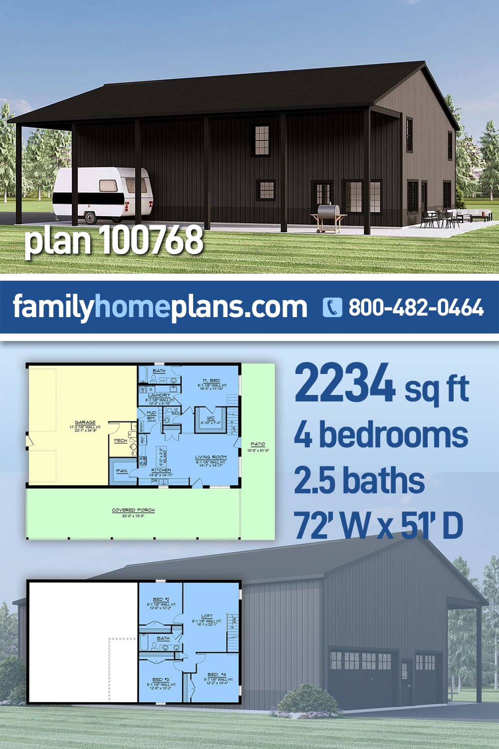 Barndominium Plan 100768 | 4 Bed Farmhouse with 3 Car Garage | 2,234 Sq Ft