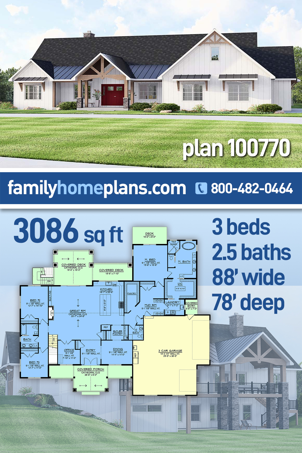 New American Style Home Plan With Lots of Storage (Plan 100770) offers 3,086 sq ft, 3 bedrooms, and 2.5 bathrooms in a beautifully designed layout. White vertical siding and a welcoming front porch with double doors create timeless curb appeal. Inside, a cathedral-ceiling great room flows into a spacious kitchen with a large island, butler’s pantry, and coffee bar. The private primary suite boasts a spa bath and massive walk-in closet with island. Bedrooms 2 and 3 share a bath, while a front office, mudroom, covered deck, and optional walkout basement add exceptional flexibility and storage.