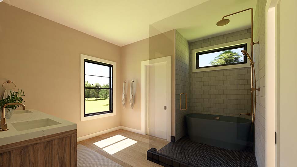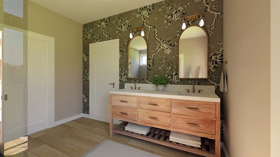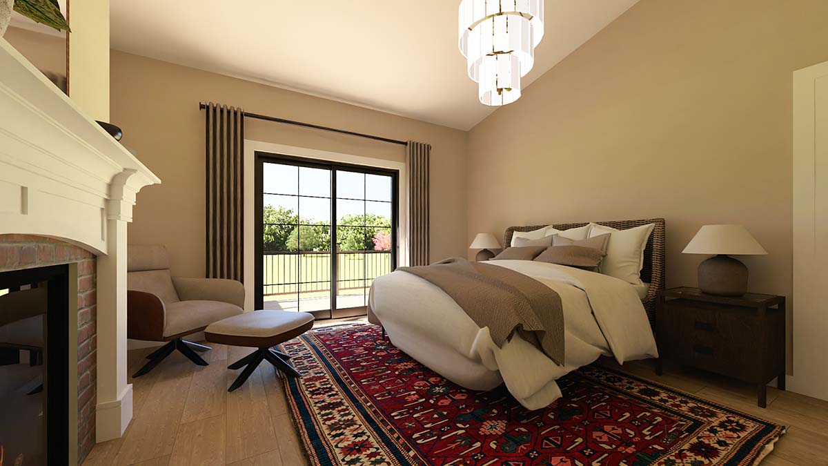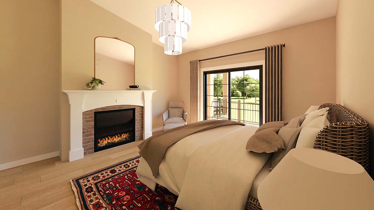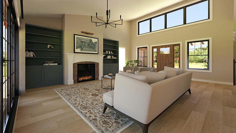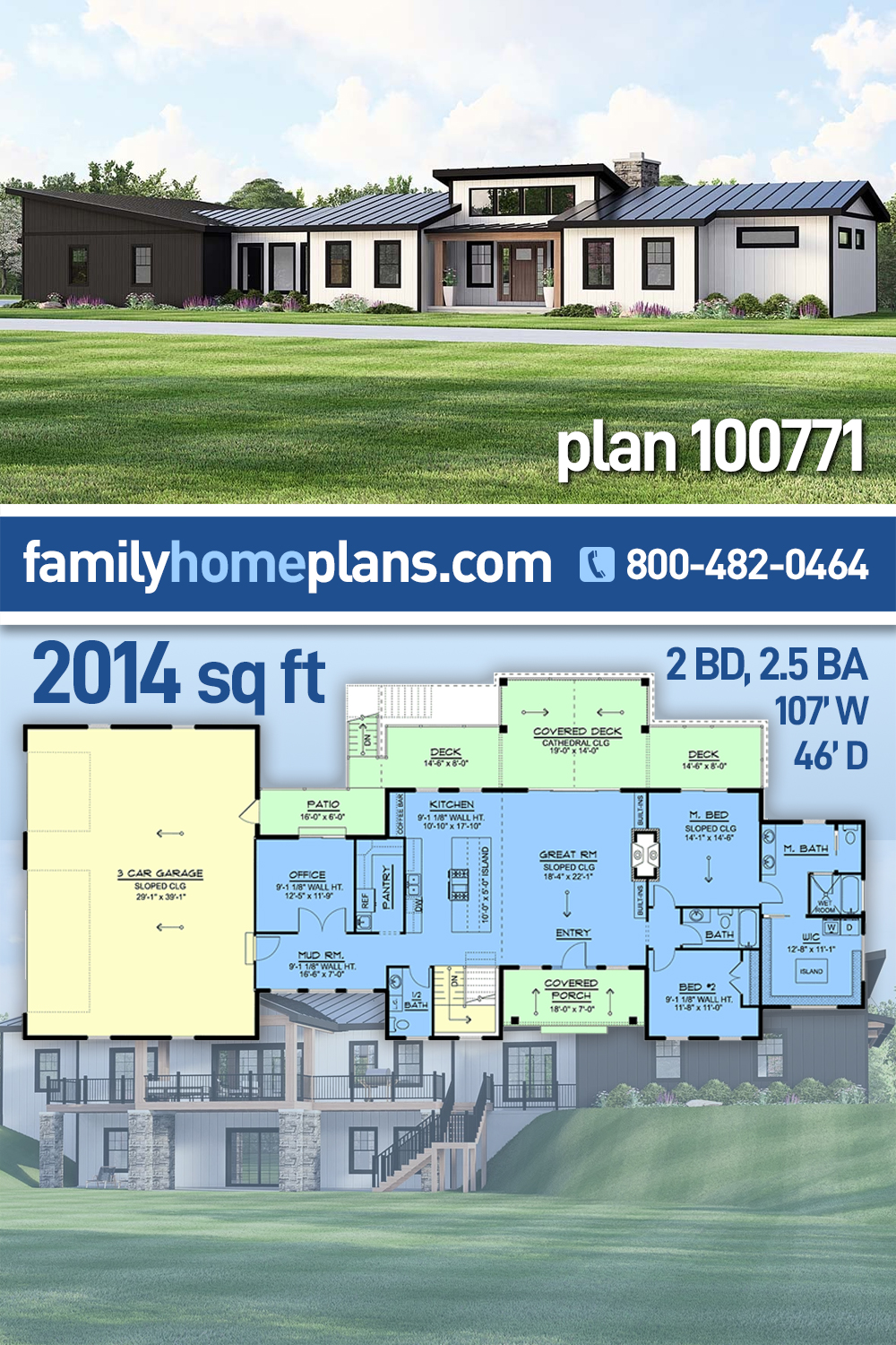 Ultra Modern Ranch Home Plan With Great Deck Space (Plan 100771) offers 2,014 sq ft, 2 bedrooms, and 2.5 bathrooms in a sleek, sprawling design 107 feet wide. A side-entry three-car garage opens to a generous mudroom, while a bright office with double doors and patio access sits nearby. The open great room and gourmet kitchen feature a massive island, walk-in prep pantry, coffee bar, and double-sided fireplace shared with the private primary suite. A cathedral-ceiling covered deck expands outdoor living, and an optional basement adds even more space.