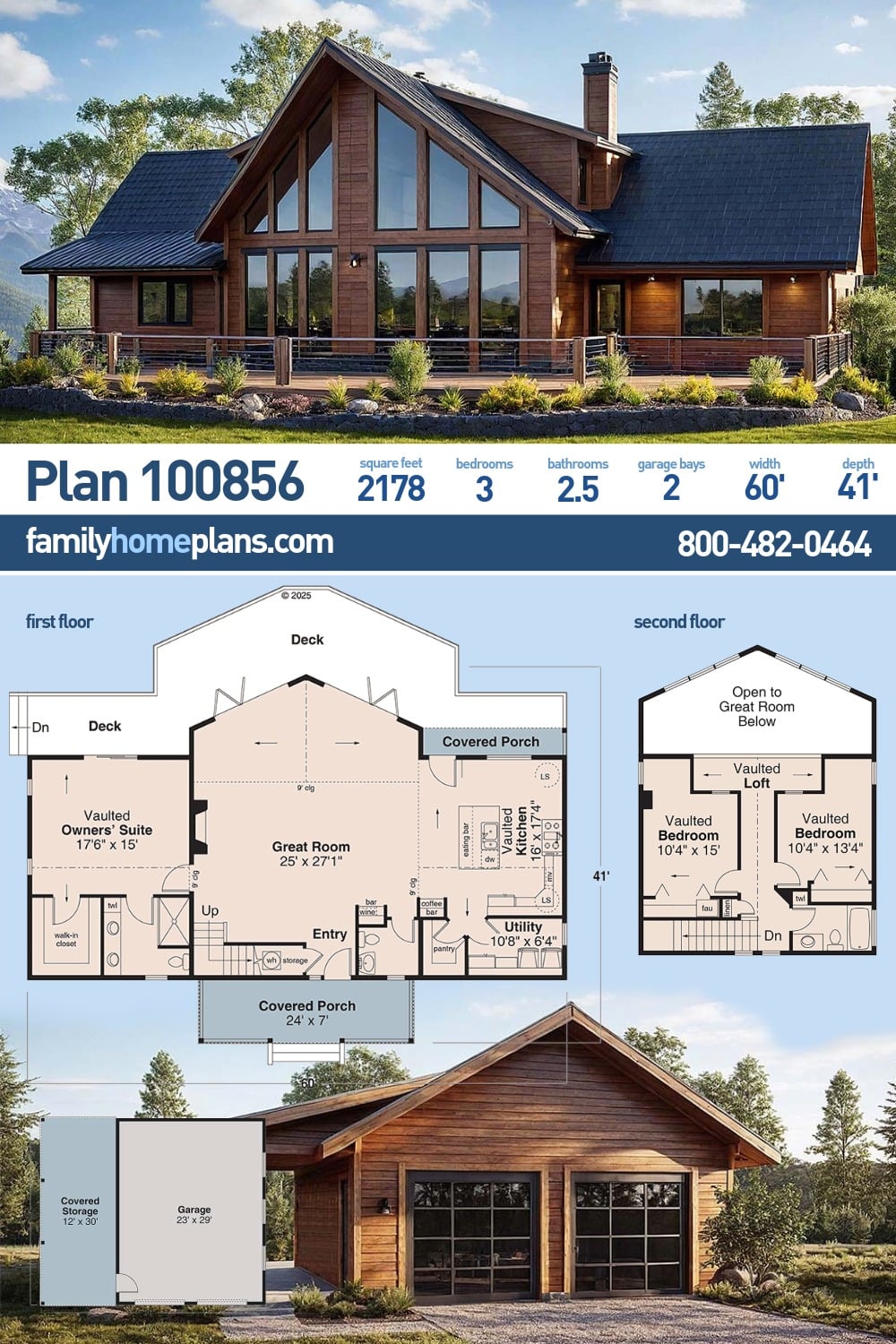 Cabin-Craftsman Style House Plan 100856 — 2,178 Sq Ft, 3 Bed, 2.5 Bath, 2-Car Garage