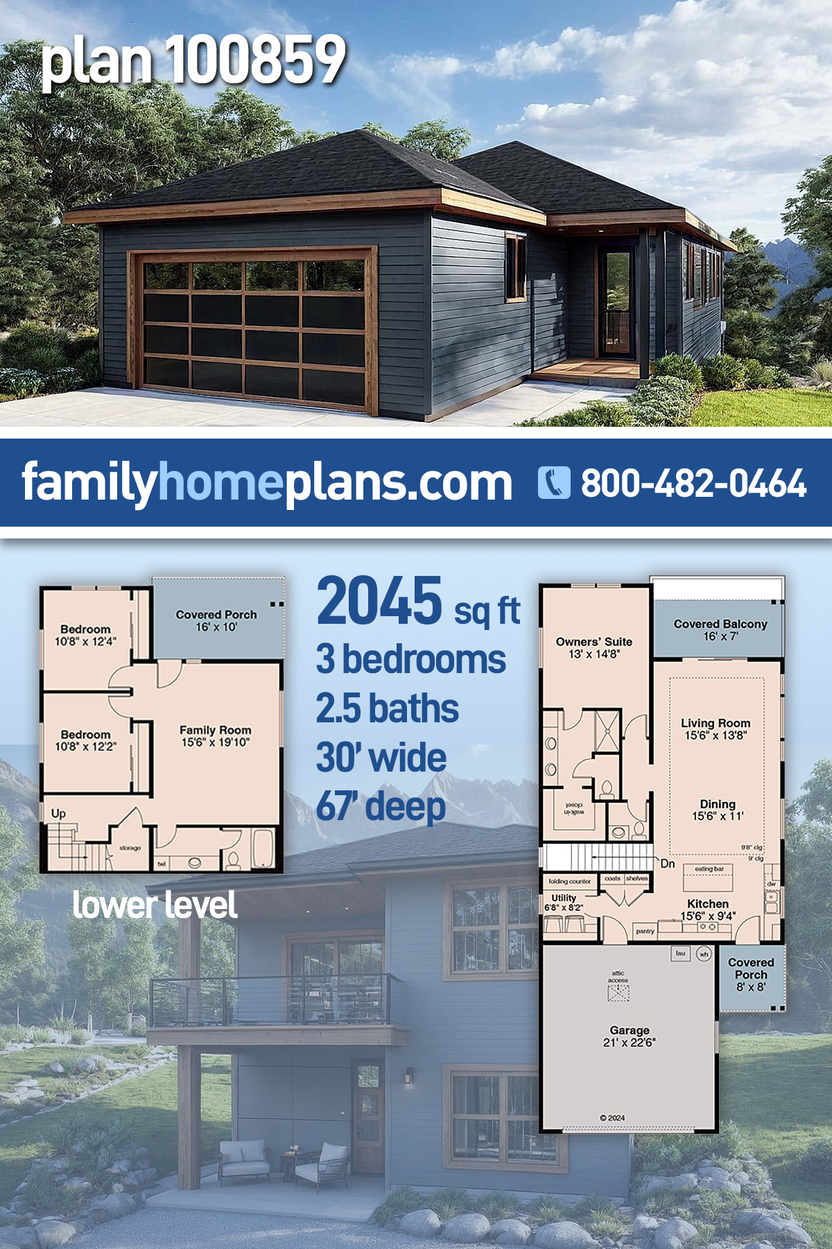 Contemporary Style Narrow Lot House Plan With Balcony (Plan 100859) delivers 2,045 sq ft of total living area, with 3 bedrooms and 2.5 bathrooms. On the main level you’ll find a 2-car garage, a laundry room and coat closet at the garage entrance, and a wonderful open plan where the kitchen with island eating bar shares space with the dining area and living room—which opens out to a covered balcony. The owner suite is also located on the main level, with a bath featuring double sinks, a walk-in shower, private toilet closet, and a sizable walk-in closet. Downstairs the lower level offers two bedrooms, a spacious family room, a bathroom where the toilet and shower are sectioned off from the sink, and access out to a covered porch.