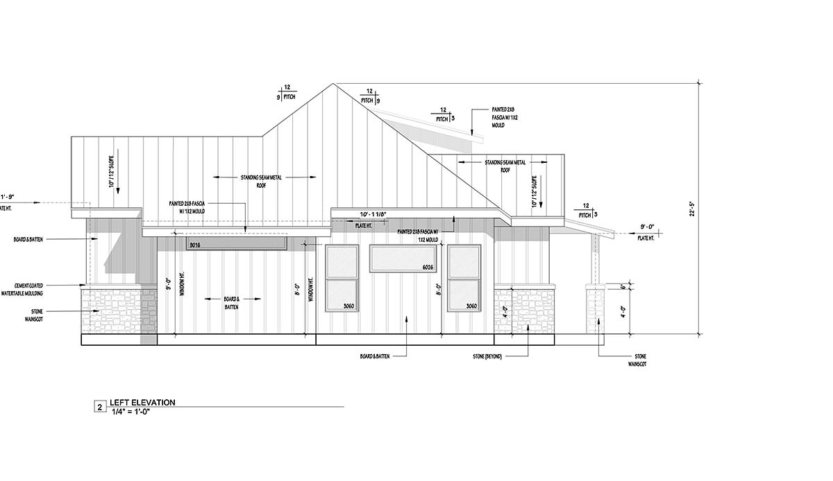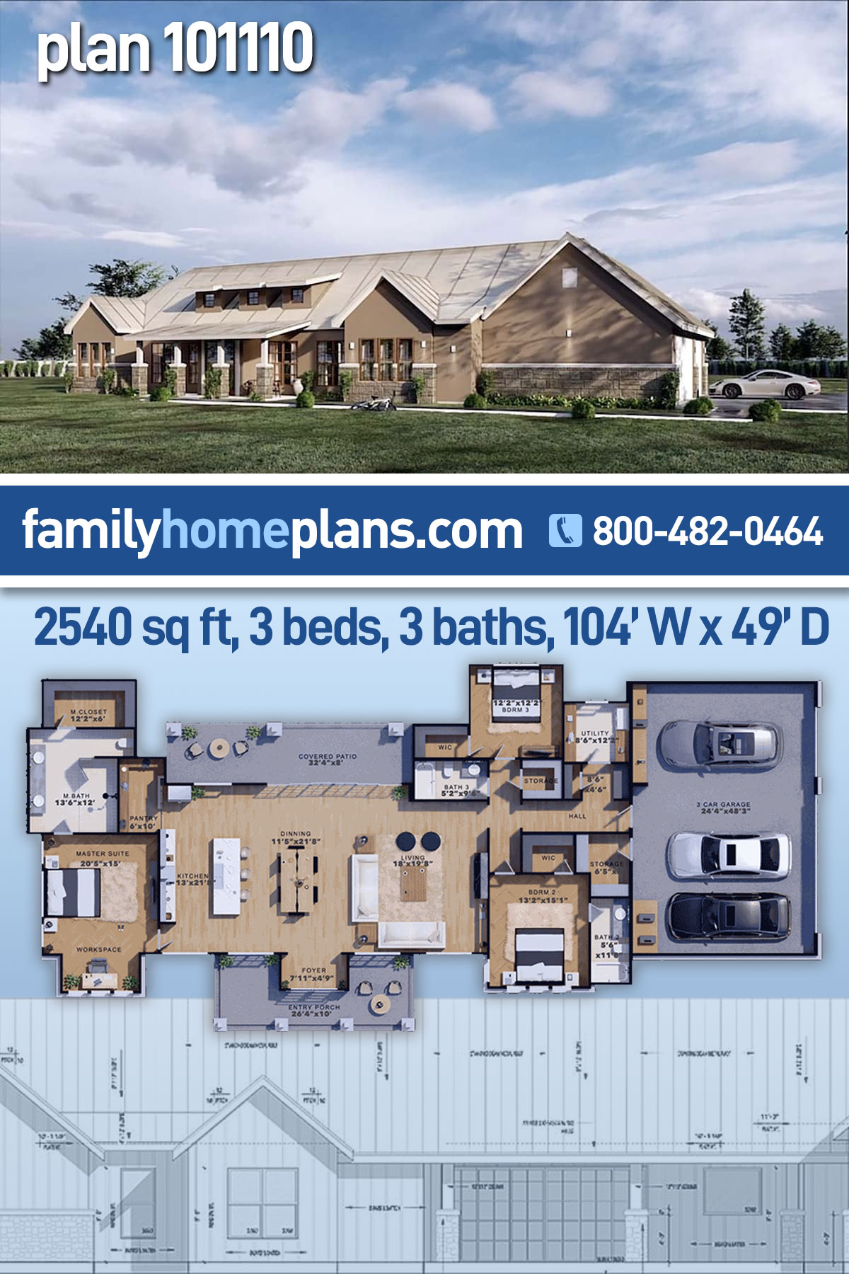 Big Country Ranch Home Plan with Oversized Garage is a one-story design with 2,540 sq ft of living space, 3 beds, 3 baths, and a 3 car garage with 895 sq ft. Open living space and abundant windows promise an interior full of light and easy entertaining. Move from the covered entry porch into a foyer and then a wide open area housing the living room on one end, kitchen on the other, and farmhouse dining table smack in the middle. Find the master suite on the left side of the floor plan. It even includes a workspace for your desk and computer. Over on the opposite end of the house, 2 more bedrooms reside, each with a WIC. Also on this end of the house we have a guest bathroom, storage, large utility room and a drop zone at the garage entrance.