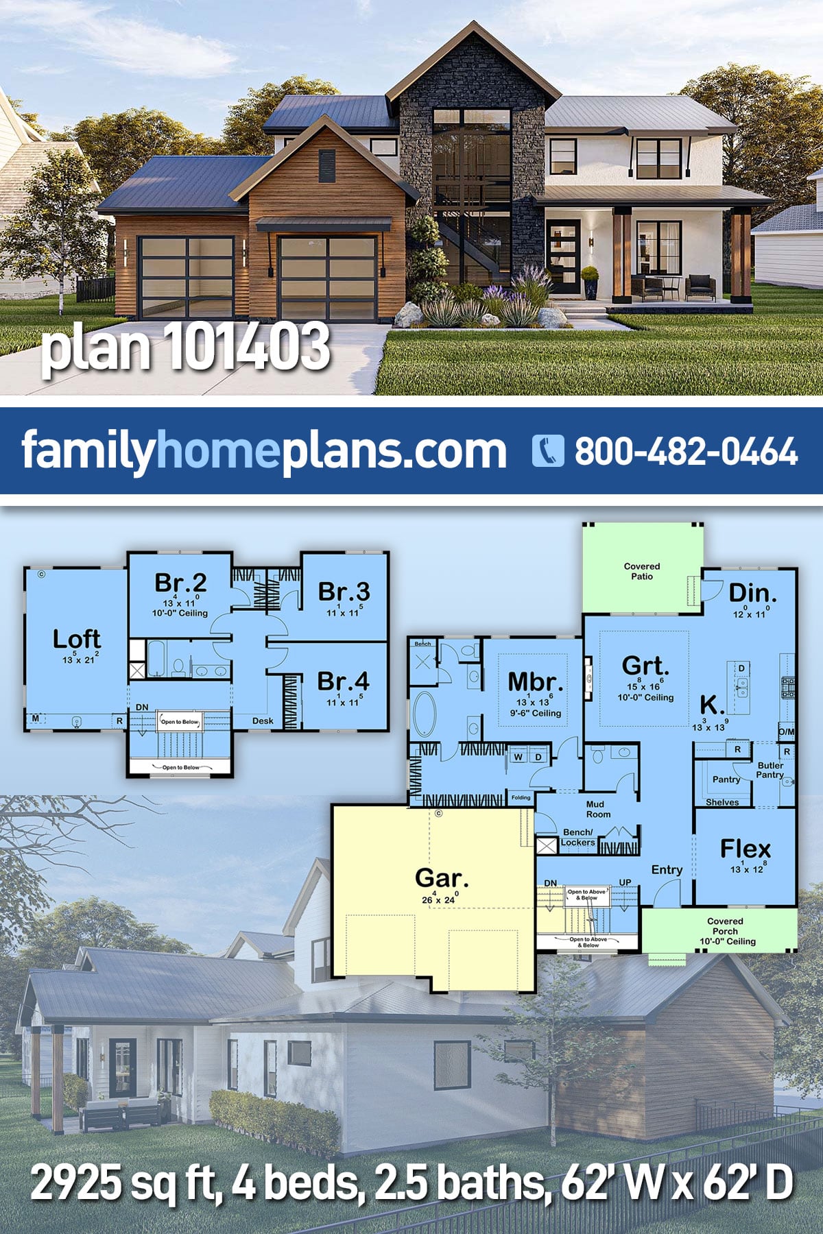 Exterior Elevations: Shows the front, rear and sides of the home including exterior materials, details and measurements.