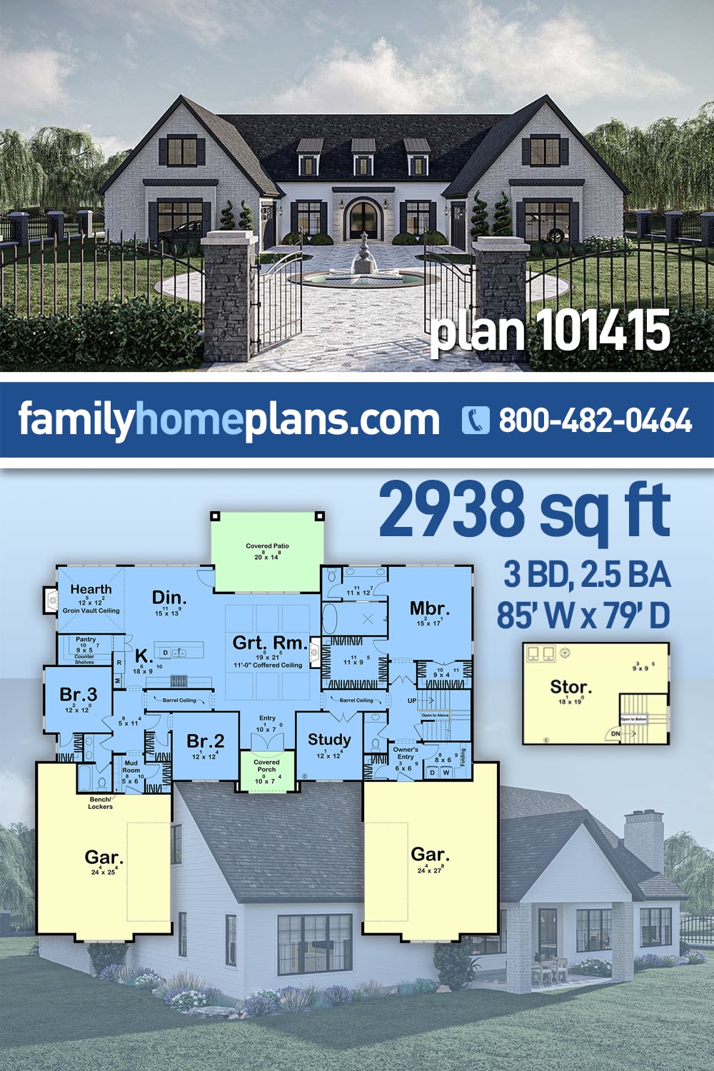 Transitional House Plan 101415 | 3 Bed 3 Bath with 4 Car Garage and a Study