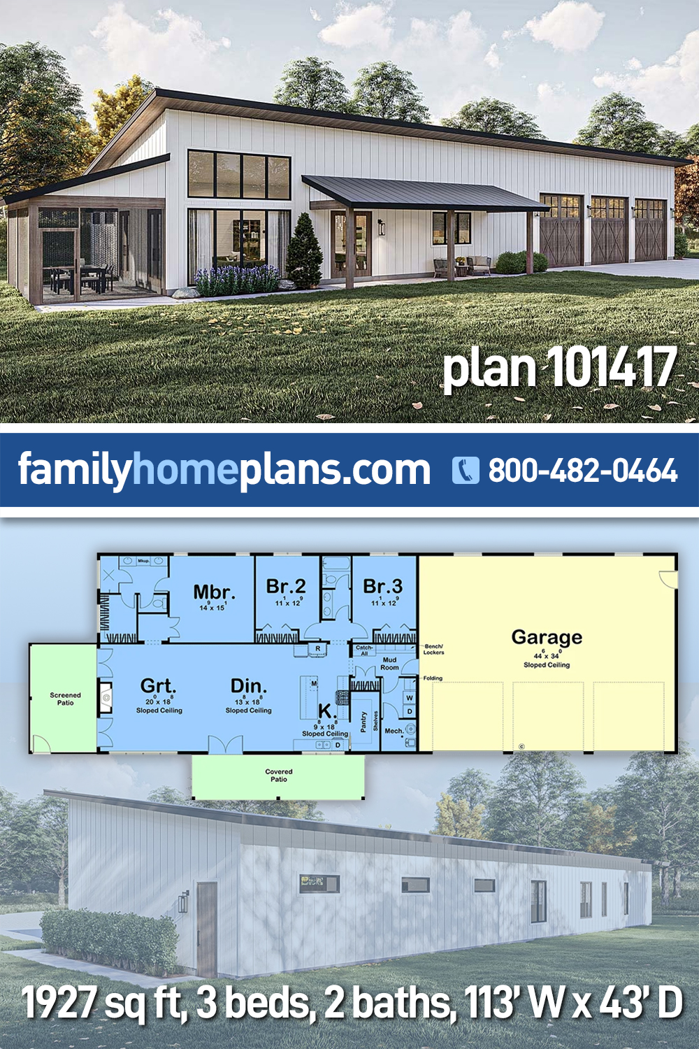 The Barndo Style Home Plan With Screened Patio (Plan 101417) blends rustic character and comfort in 1,927 sq ft with 3 bedrooms and 2 bathrooms, highlighted by a front-facing three-car garage and inviting covered entry. Double doors open to a spacious great room anchored by a fireplace and flanked by doors leading to a relaxing screened patio. The open dining area flows naturally into the island kitchen with a walk-in pantry, creating an easy space for everyday living and entertaining. A well-designed mudroom connects the kitchen to the garage and includes bench storage, a coat closet, laundry access, and mechanical space. Two rear bedrooms share a hall bath, while the private primary suite features double-door entry, a walk-in shower, dual sinks, and a generous walk-in closet.