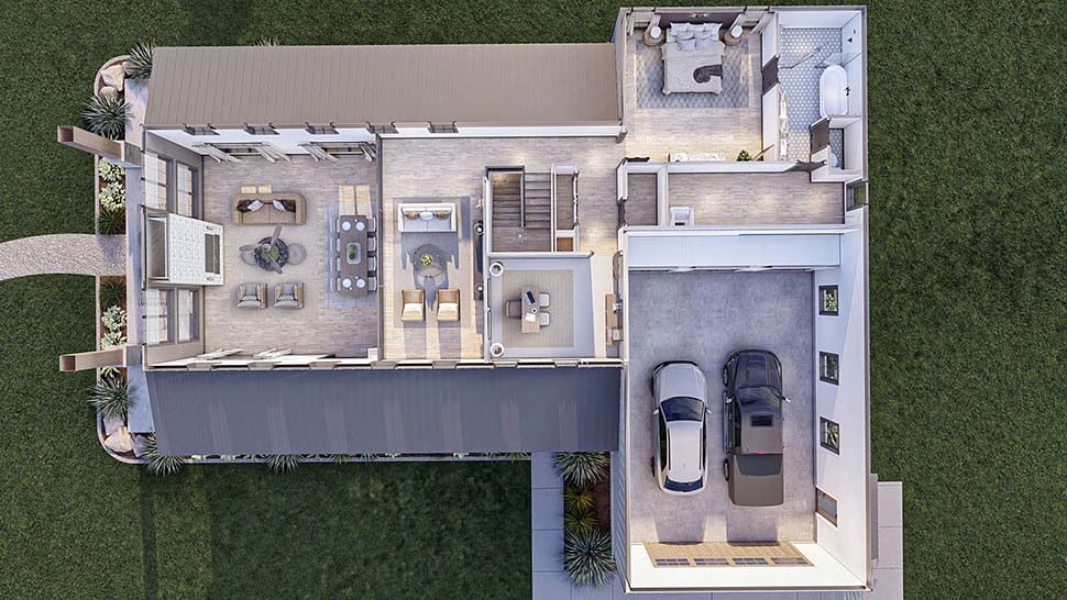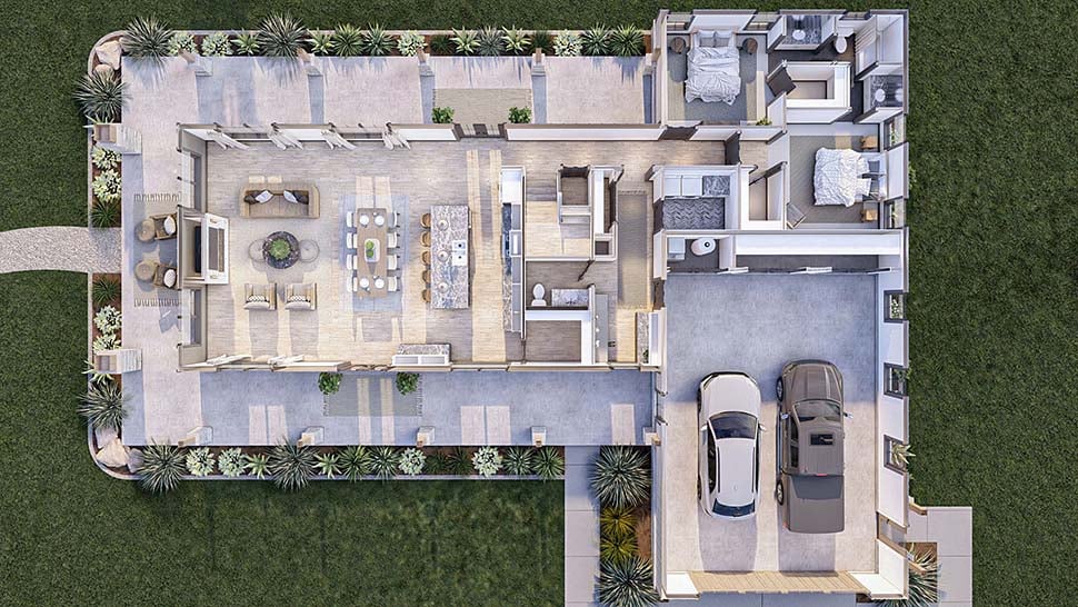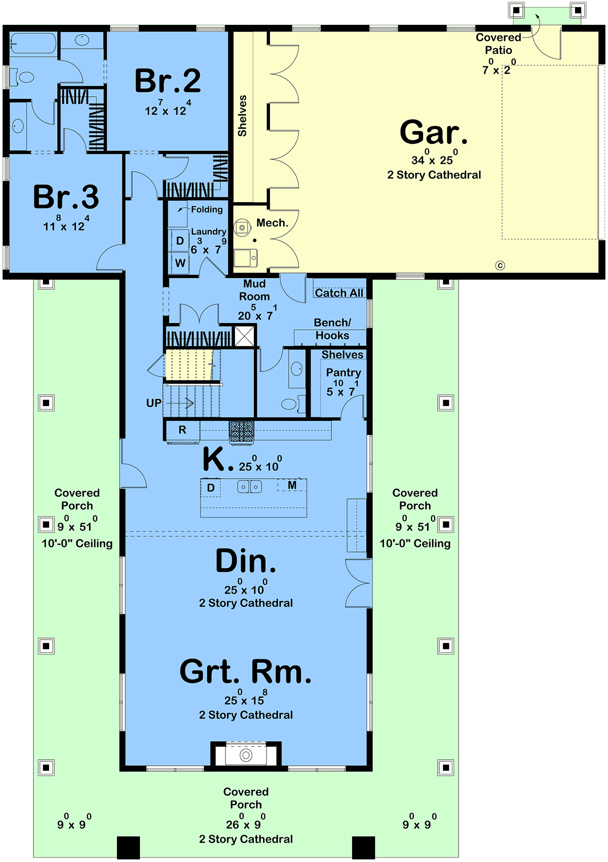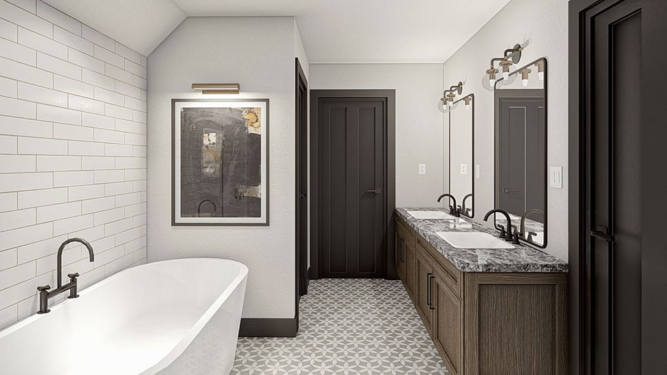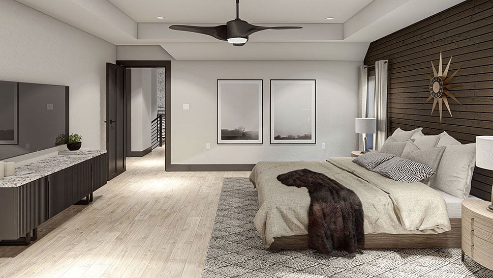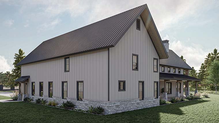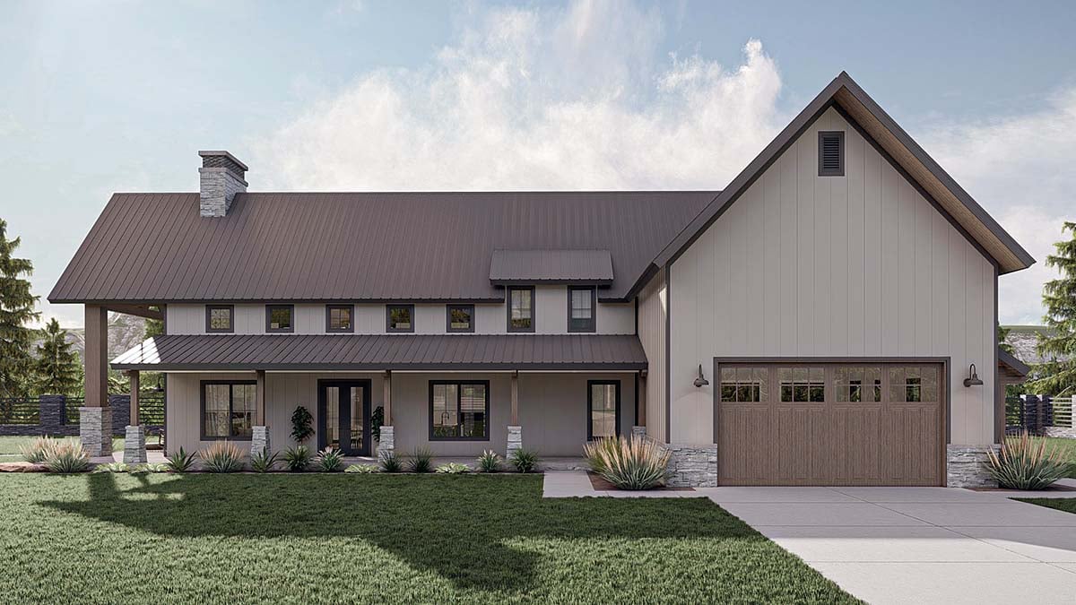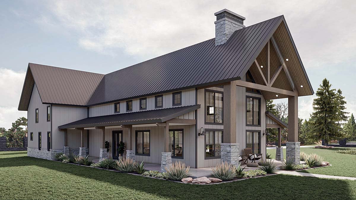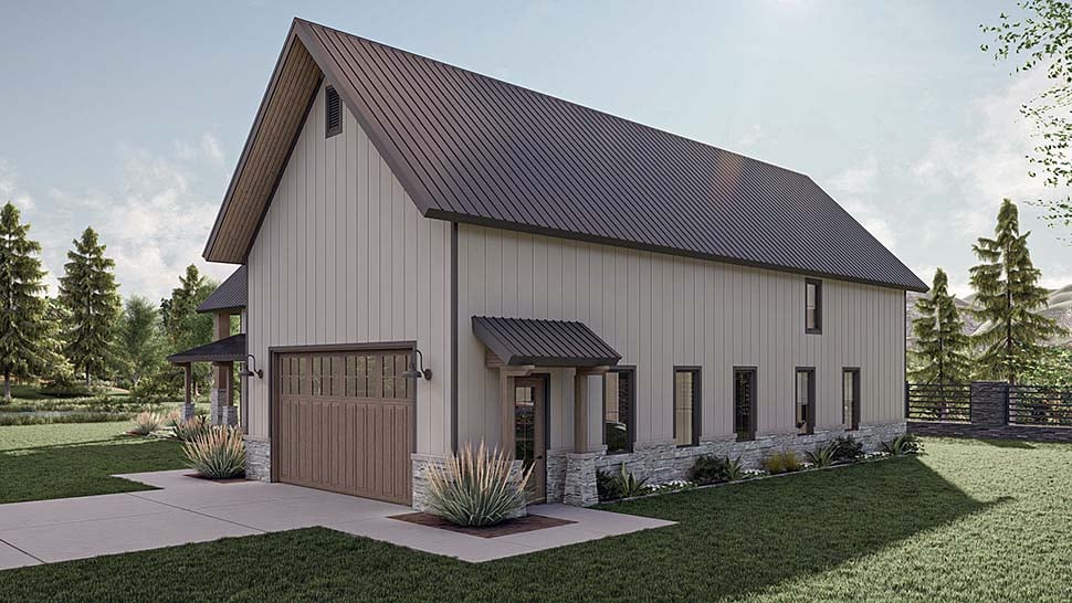 Our Barndominium-style house plan combines the best of both worlds - a visually captivating exterior with a well-thought-out interior that prioritizes comfort, convenience, and modern living. With its spacious covered porches, an oversized garage, open living spaces, and a unique guest room and master suite layout, this home is the perfect blend of rustic charm and contemporary luxury. It's a place where you can create lasting memories and enjoy the beauty of the outdoors from the comfort of your own sanctuary.