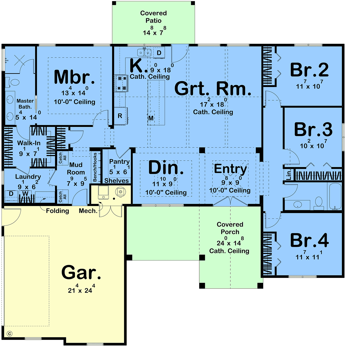 Ranch Style, 1925 Sq Ft, 4 Bed, 2 Bath, 2 Car | Plan 101449