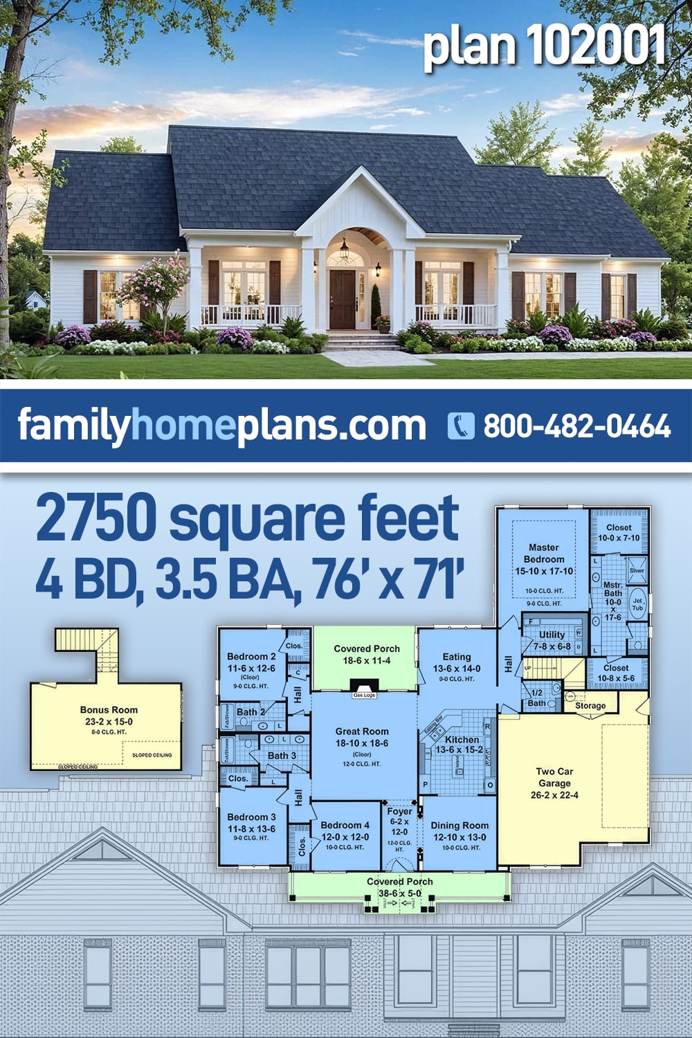 Country Farmhouse House Plan 102001 | 4 Bed Family Home with Bonus Room | 2,750 Sq Ft