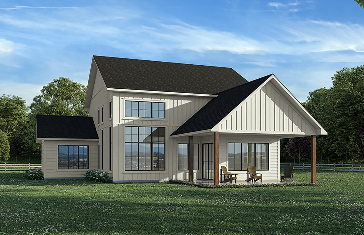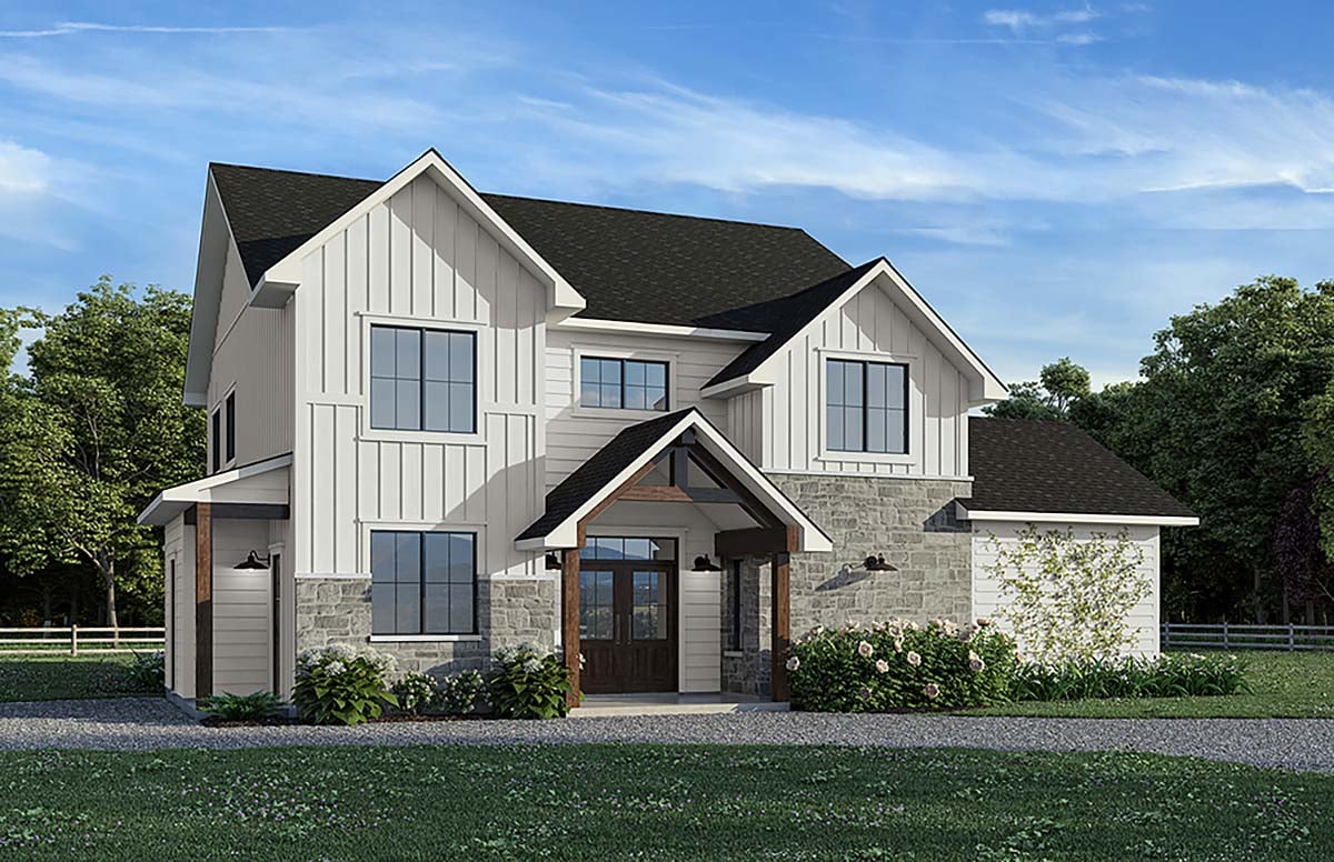 Discover this stunning two-story Farmhouse-style home plan, designed to perfectly blend rustic charm with modern comfort. From the very first glance, the inviting façade captivates with its elegant mix of stone and board & batten siding, creating a warm, semi-rustic look that feels timeless and welcoming. Whether nestled in the countryside or in a residential neighborhood, this home promises instant curb appeal and an unforgettable first impression.