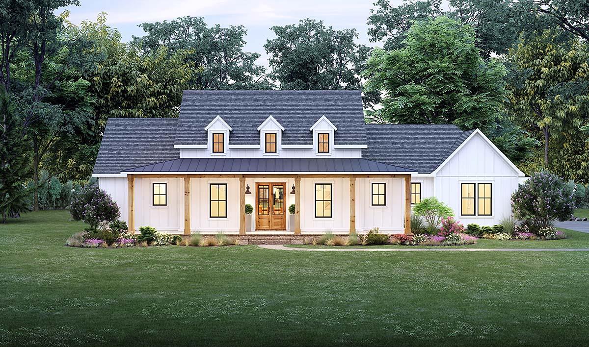 One -Story Farmhouse Home Plan 41424 has 2,232 square feet of living space, 4 bedrooms, and 2.5 bathrooms. In addition, the outdoor living space is exceptional. For example, the back covered porch is designed with an outdoor kitchen and a fireplace.