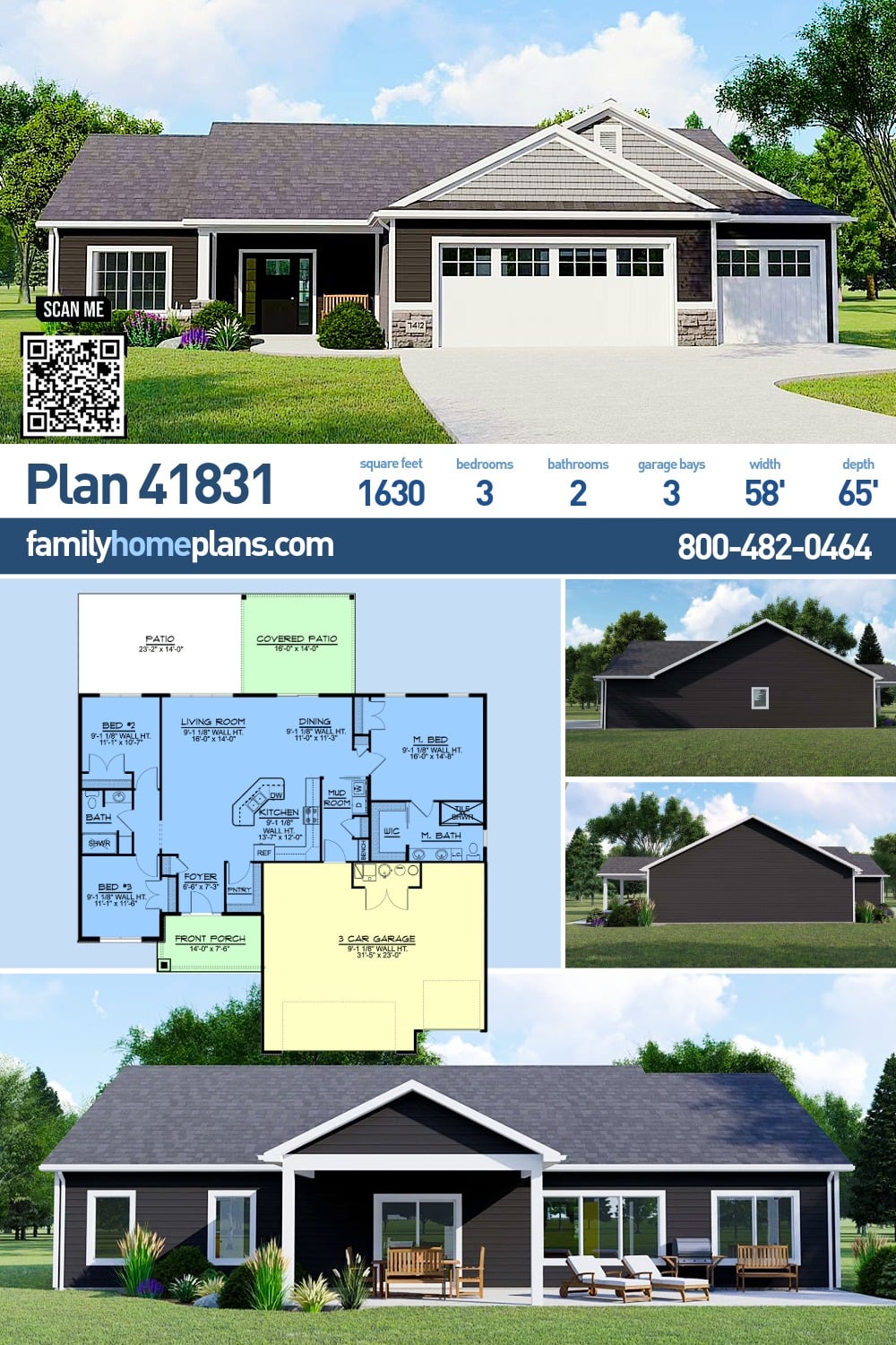 Craftsman Ranch Traditional Style House Plan 41831 with 1630 Sq Ft, 3 Bed, 2 Bath, 3 Car Garage