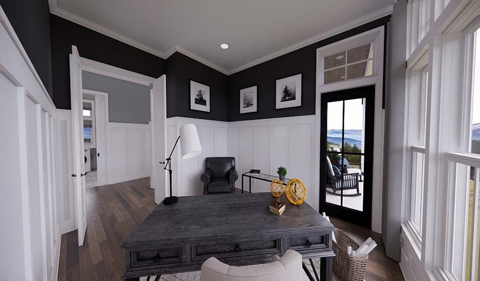 French doors lead in to a spacious home office with large windows and access to the covered rear porch.