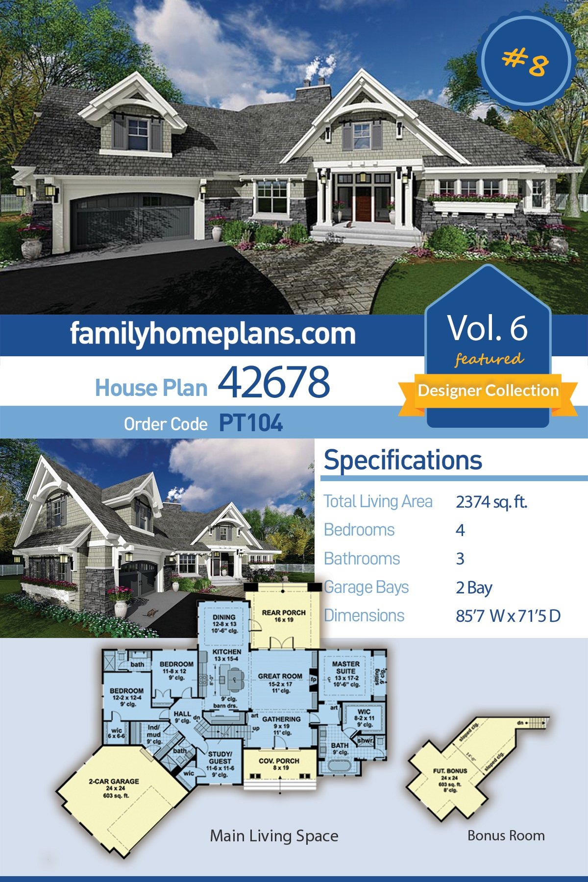 Cottage, Craftsman, Tudor Style House Plan 42678 with 2374 Sq Ft, 4 Bed, 3 Bath, 2 Car Garage