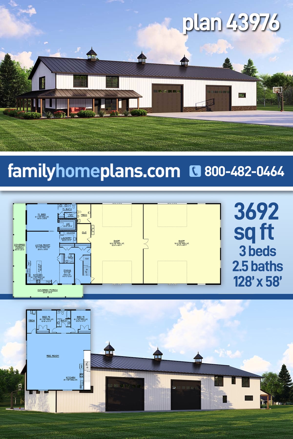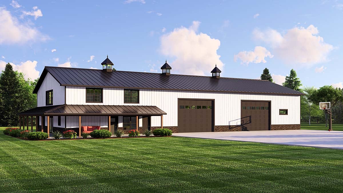 Plan 43976 | Barndominium, Country, Farmhouse House with 3 Bed, 4 Bath, 4 Car