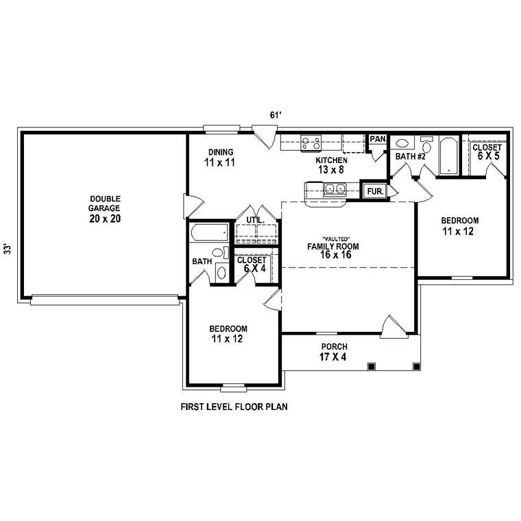Traditional Style House Plan 44930 with 1044 Sq Ft, 2 Bed, 2 Bath, 2 Car Garage
